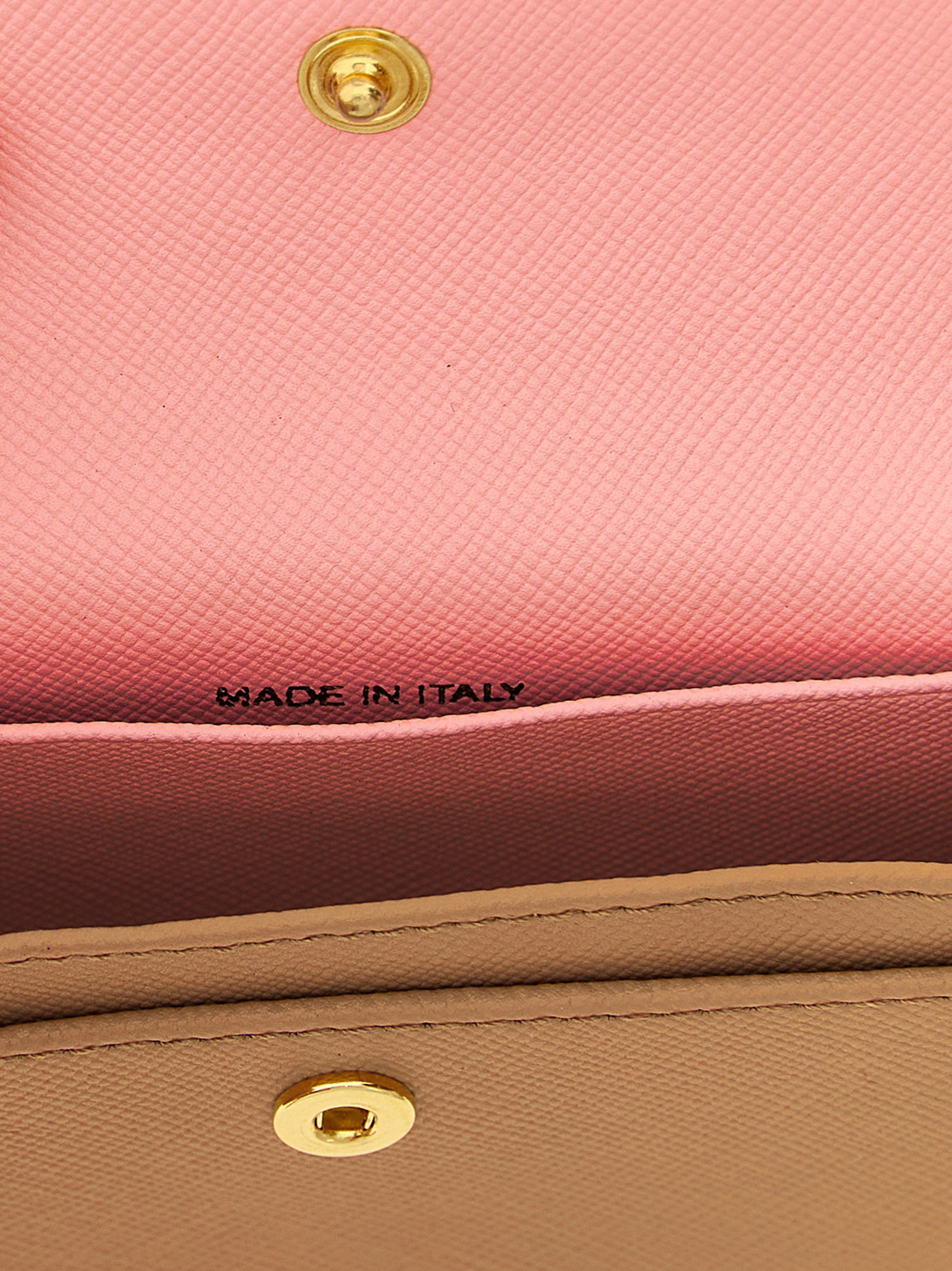 Saffiano leather business card holder with flap closure with snap button and front embossed logo.