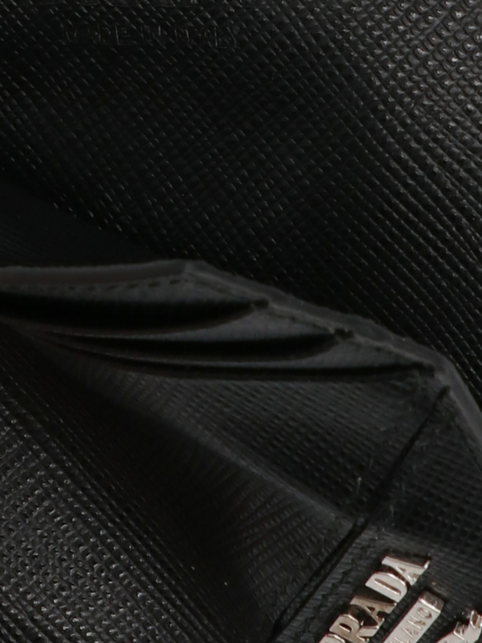Prada saffiano leather card holder with triangle logo.