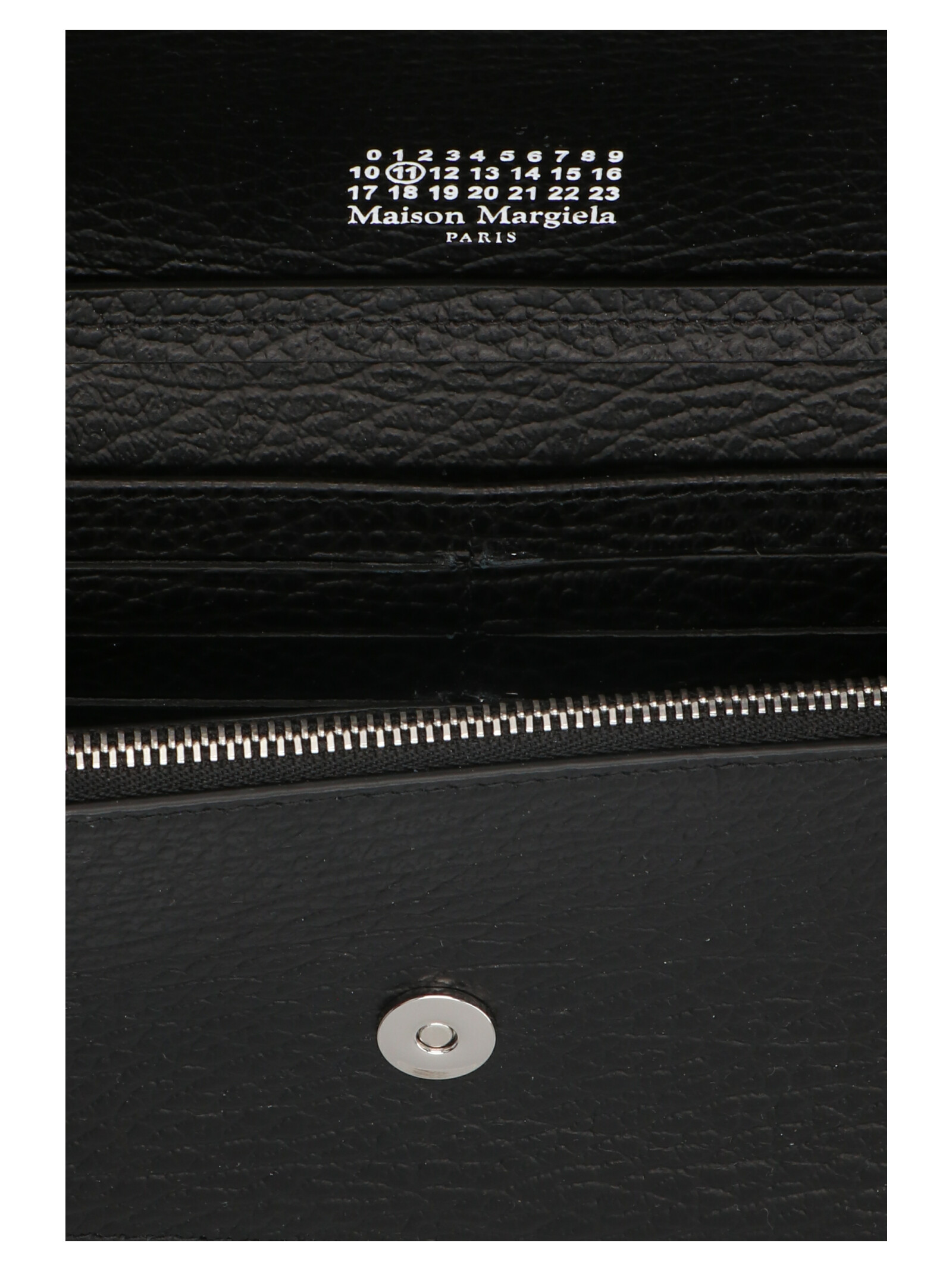 Leather chain wallet featuring stitching logo and a shoulder strap.