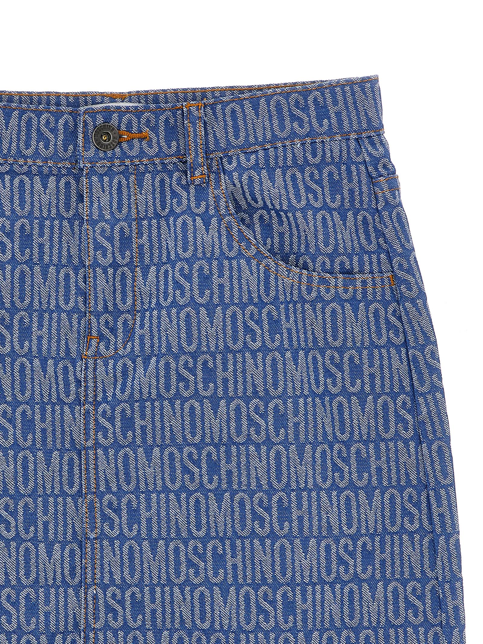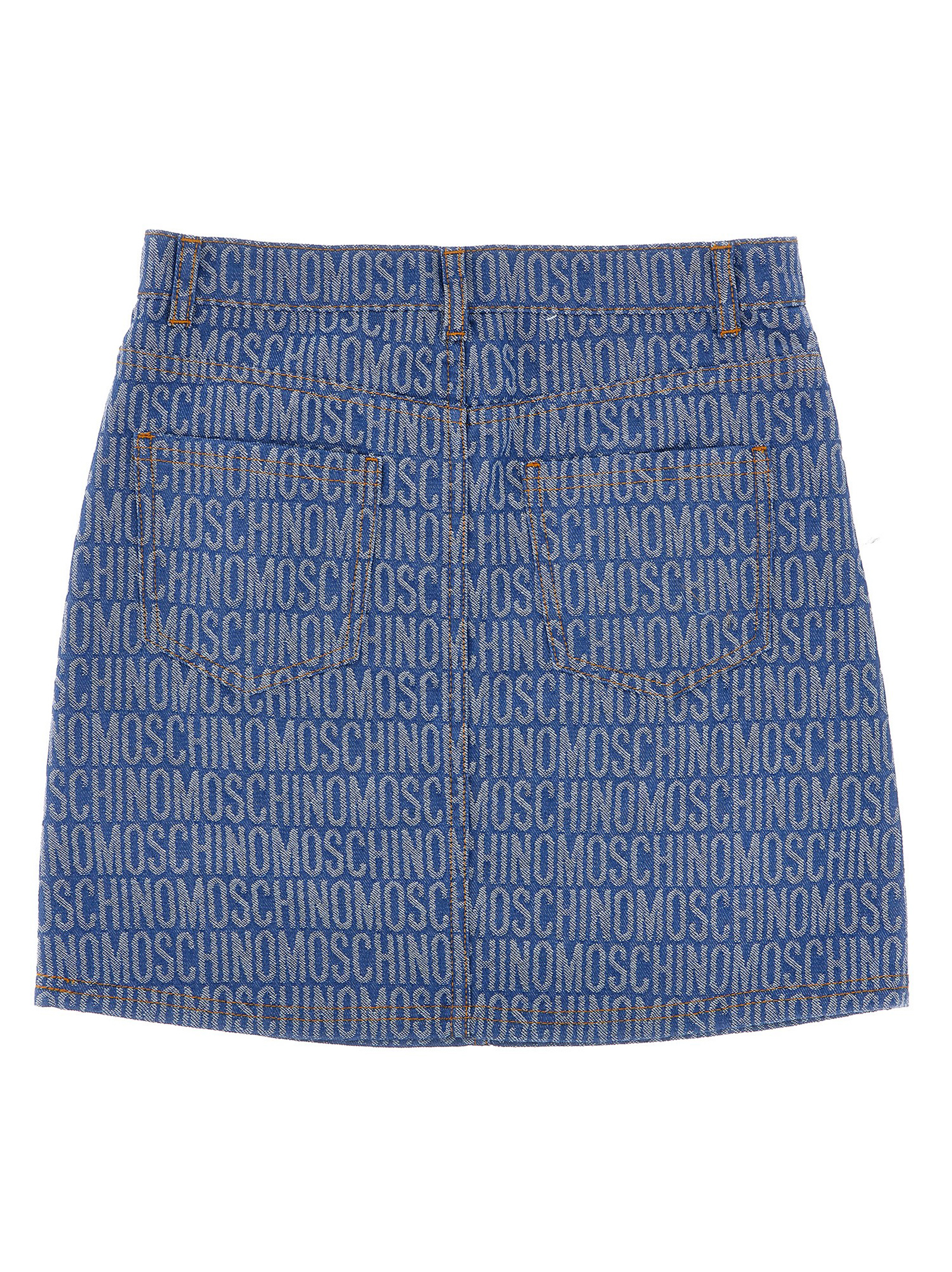 Cotton denim blend skirt with all-over ‘Logo’ pattern, zip and button closure, five pockets.