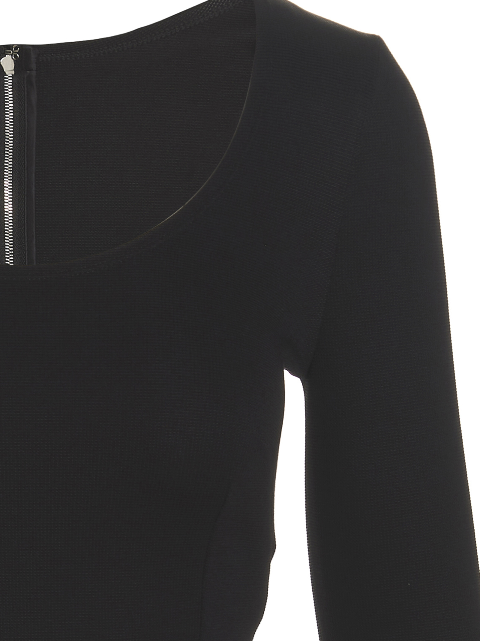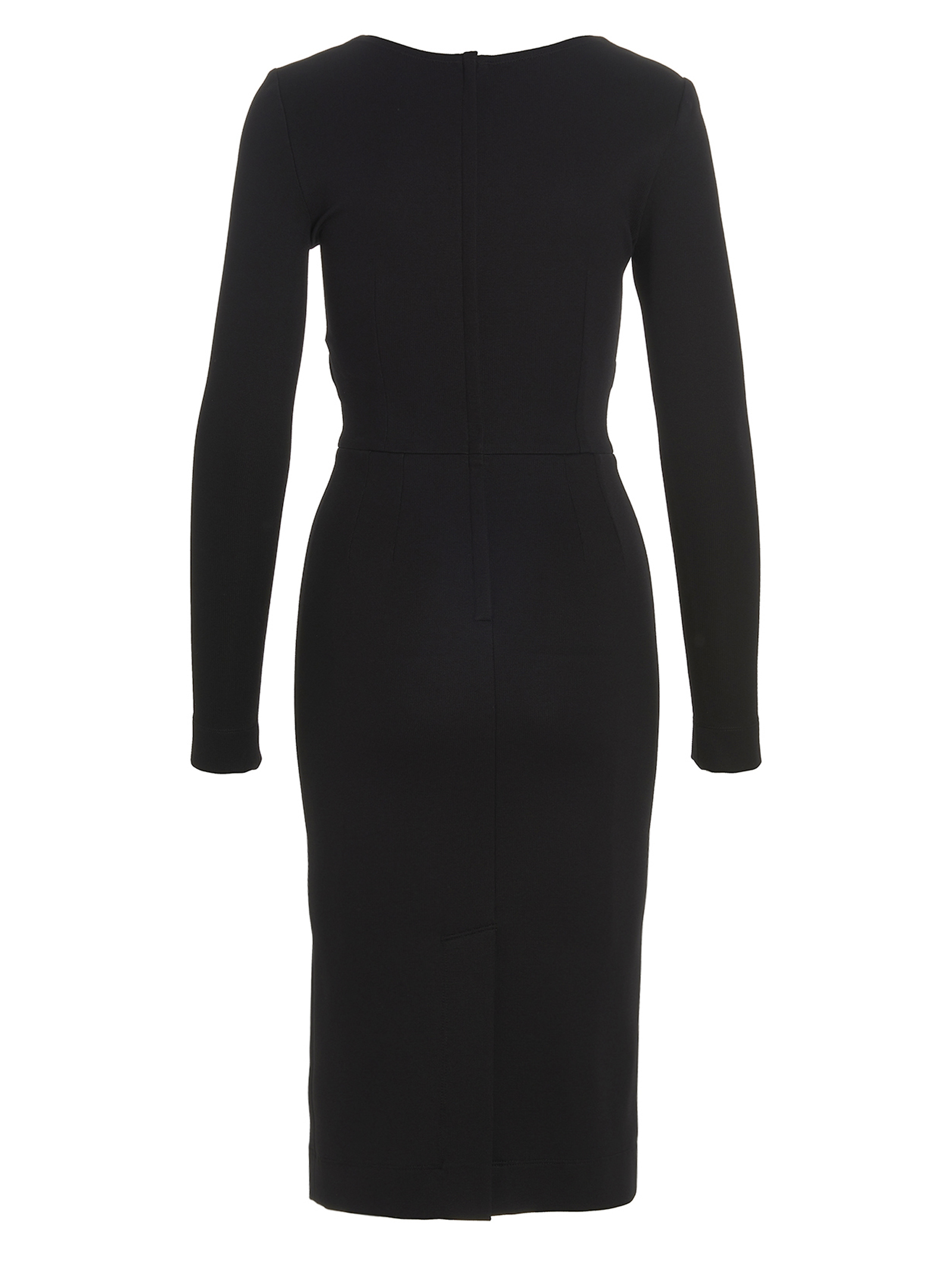 Stretch viscose midi dress with wide round neckline and metal logo detail.