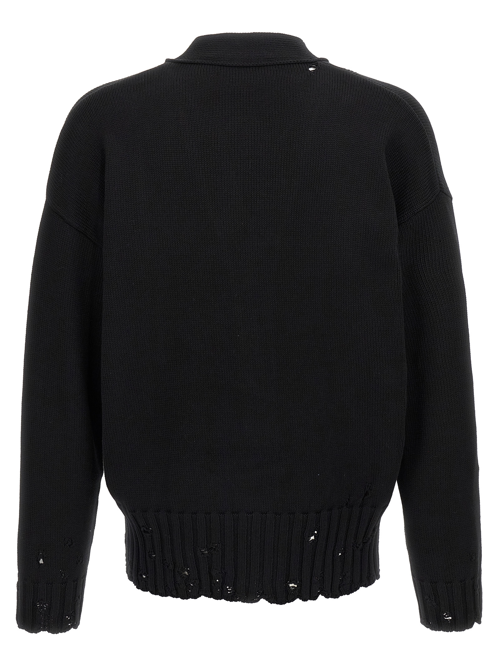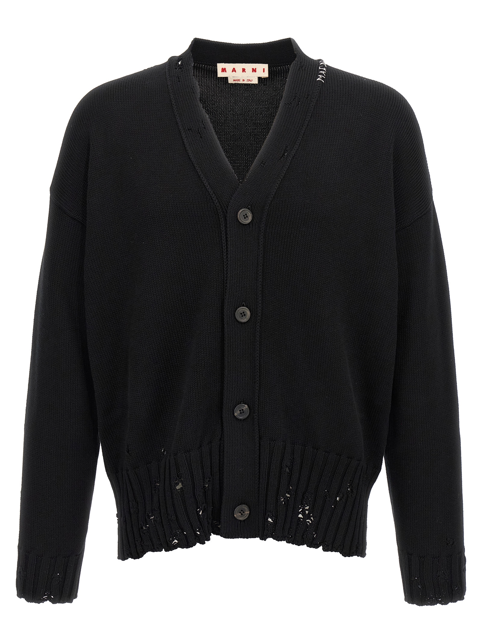 Destroyed effect cotton cardigan, contrast ‘Marni Symbol’ logo embroidery and front button closure, V-neck, long sleeves with cuffs and dropped shoulders.