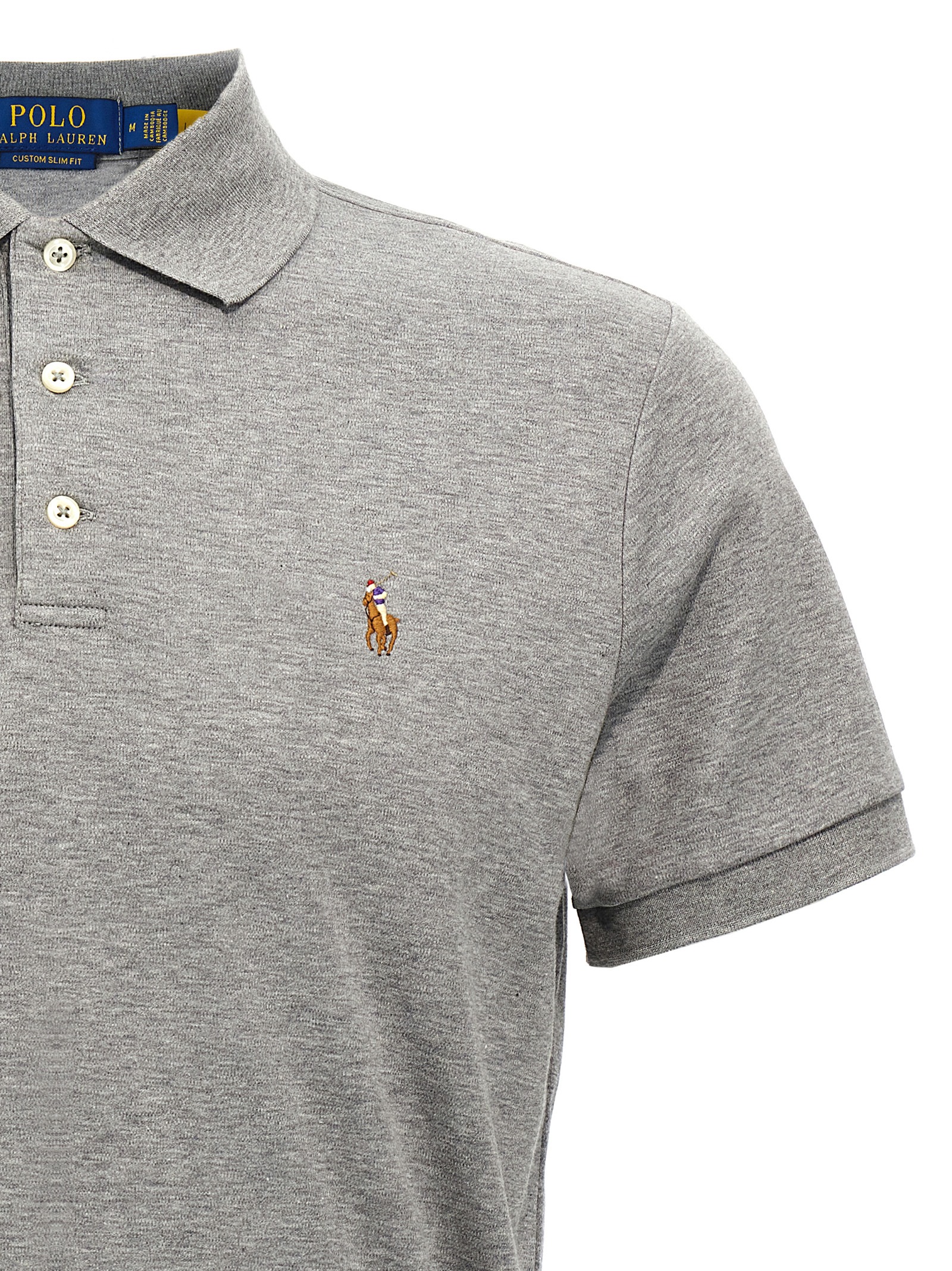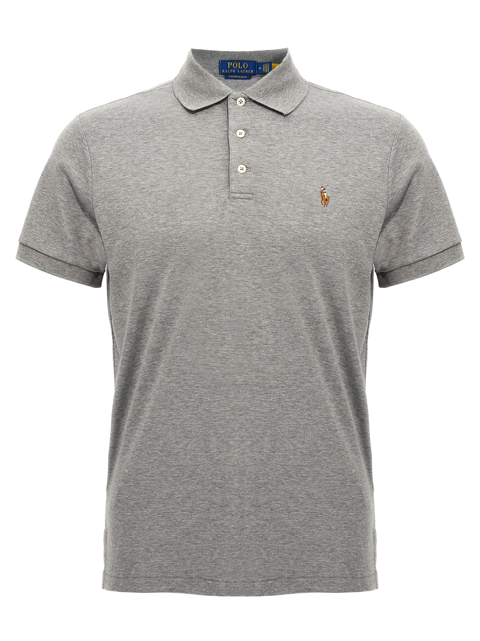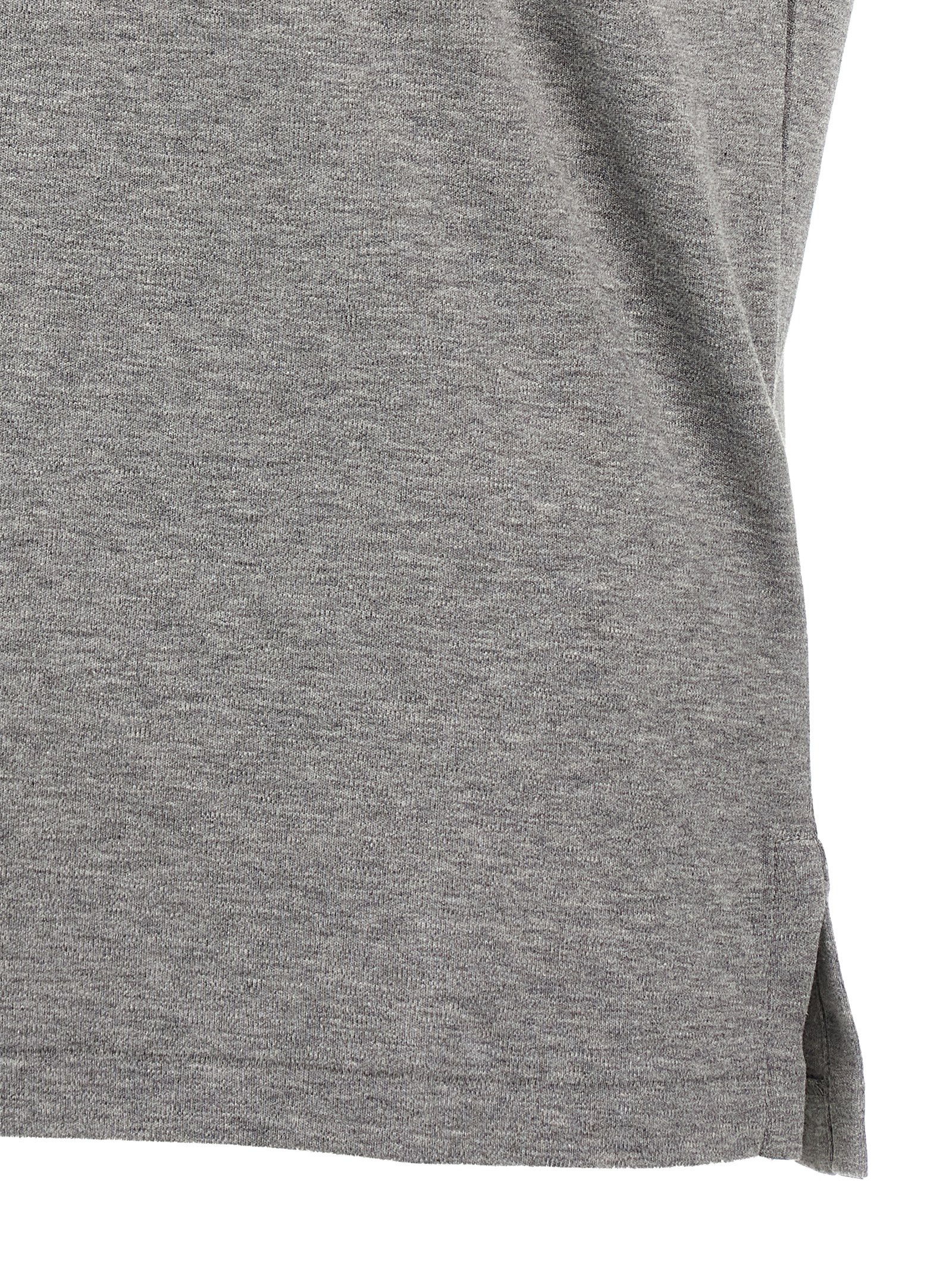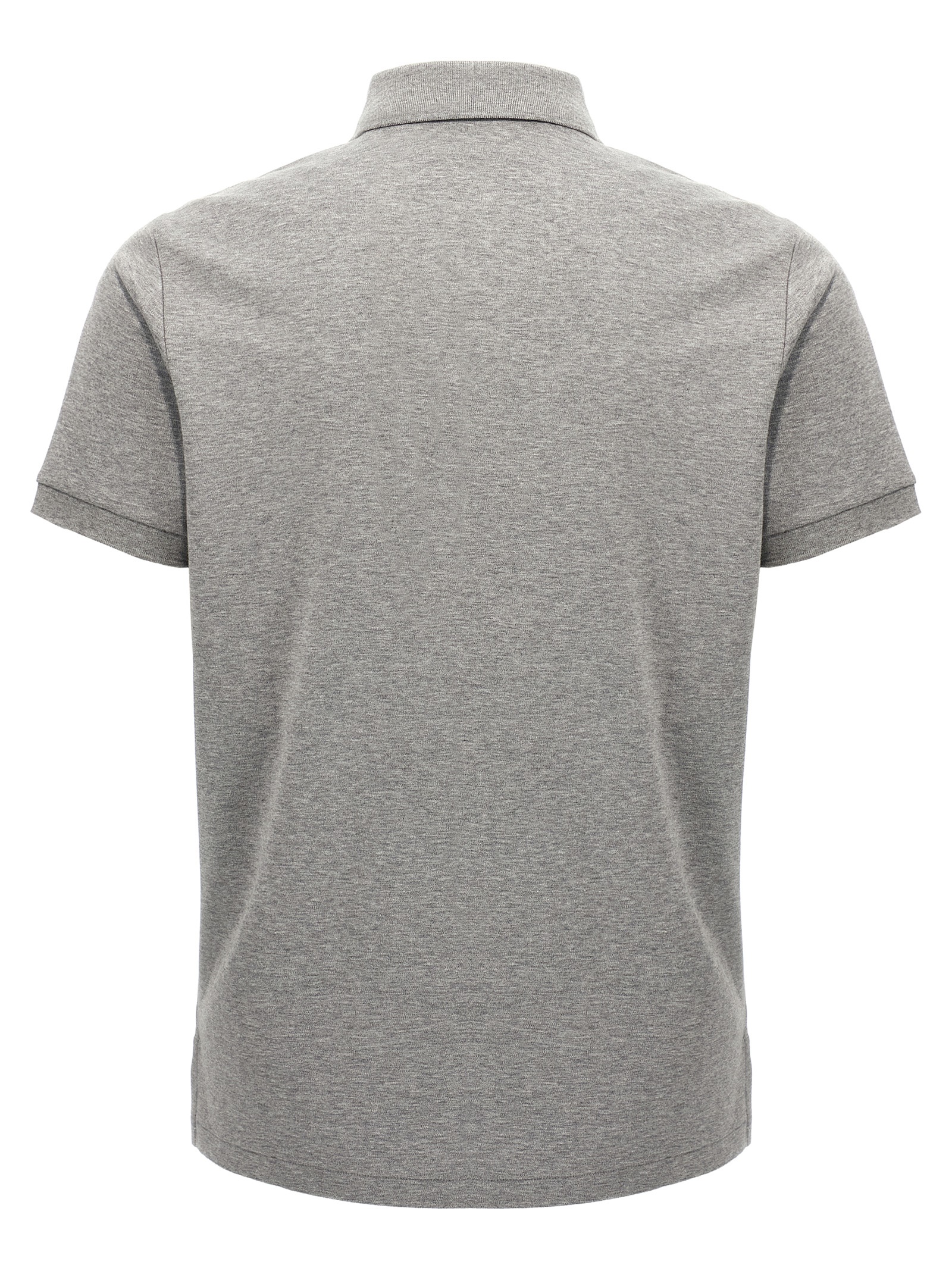 Melange stretch cotton polo shirt with front logo embroidery, collar and buttons, side slits, and short sleeves.