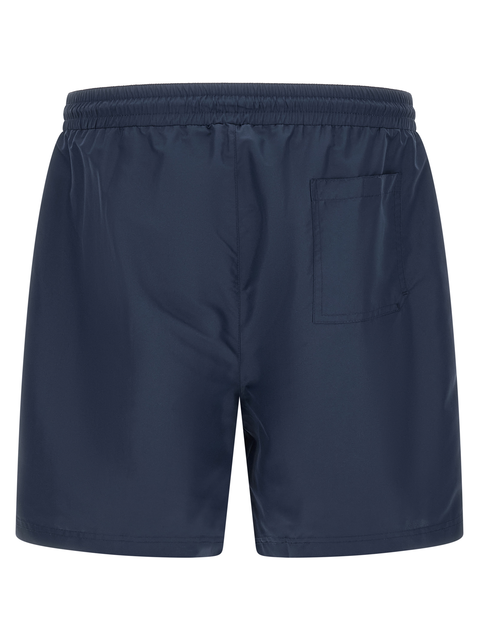 Matt nylon swimsuit, embroidered logo heraldic coat of arms of Solomeo on the front, elastic with drawstring at the waist, trompe l’oeil flap, pockets, inner mesh briefs.