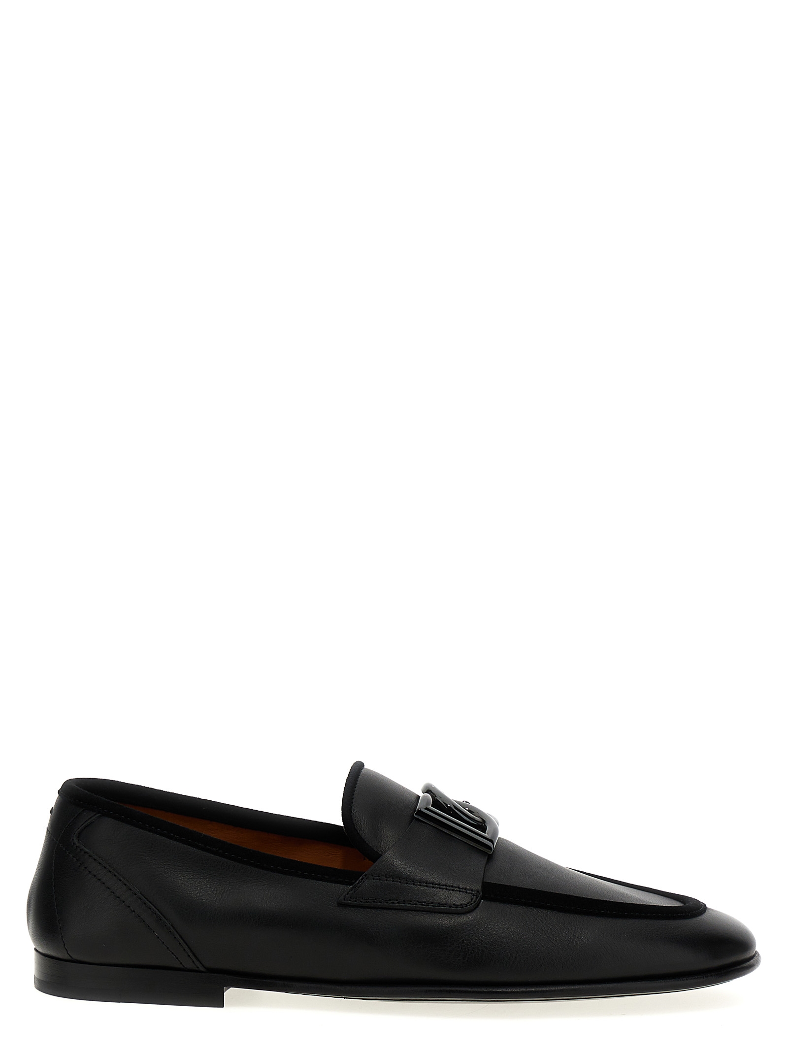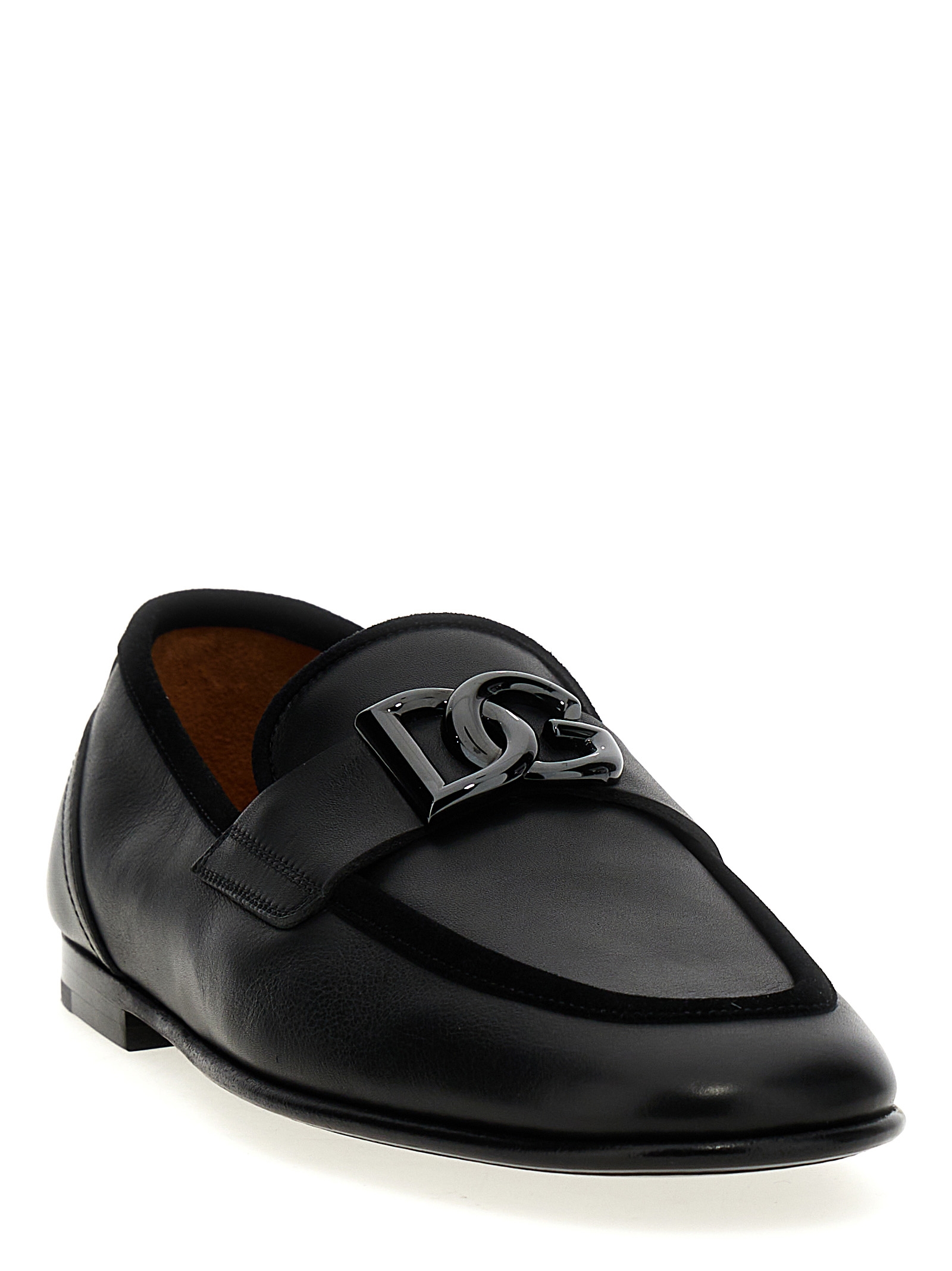 Leather loafers with suede detail, front metal logo appliqué, and leather sole.