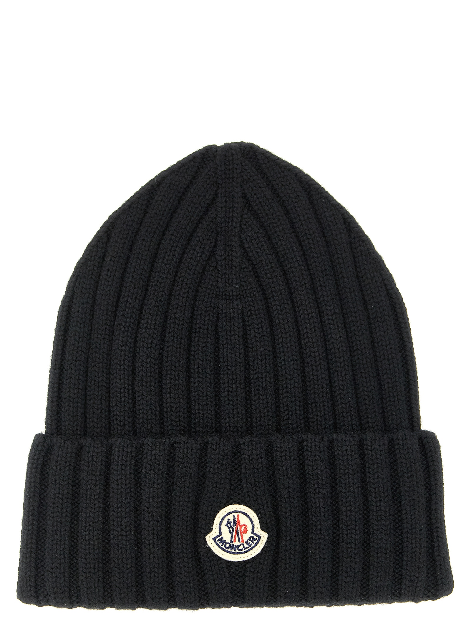 Virgin wool ribbed knit beanie with turn-up with front felt logo patch.
