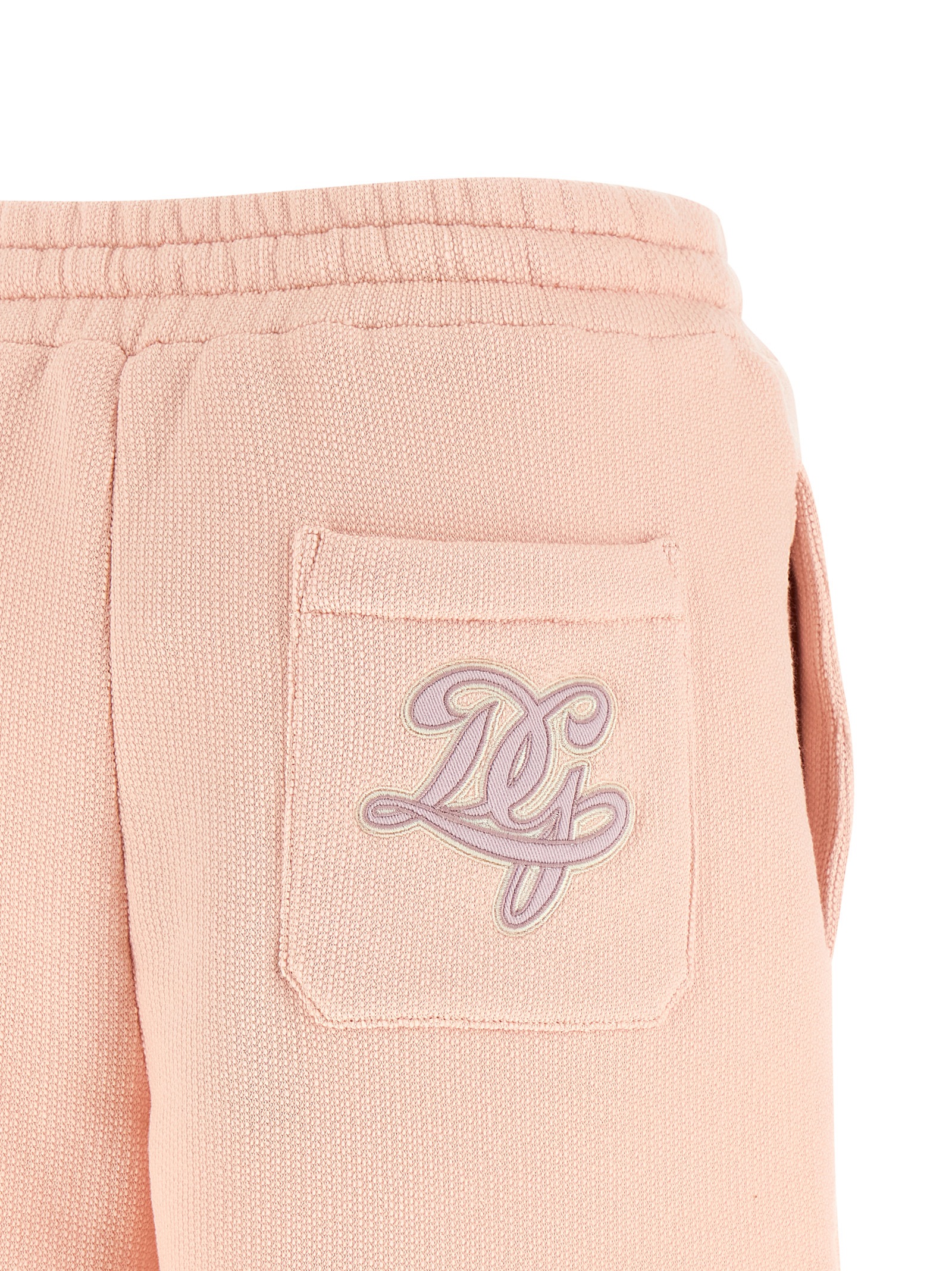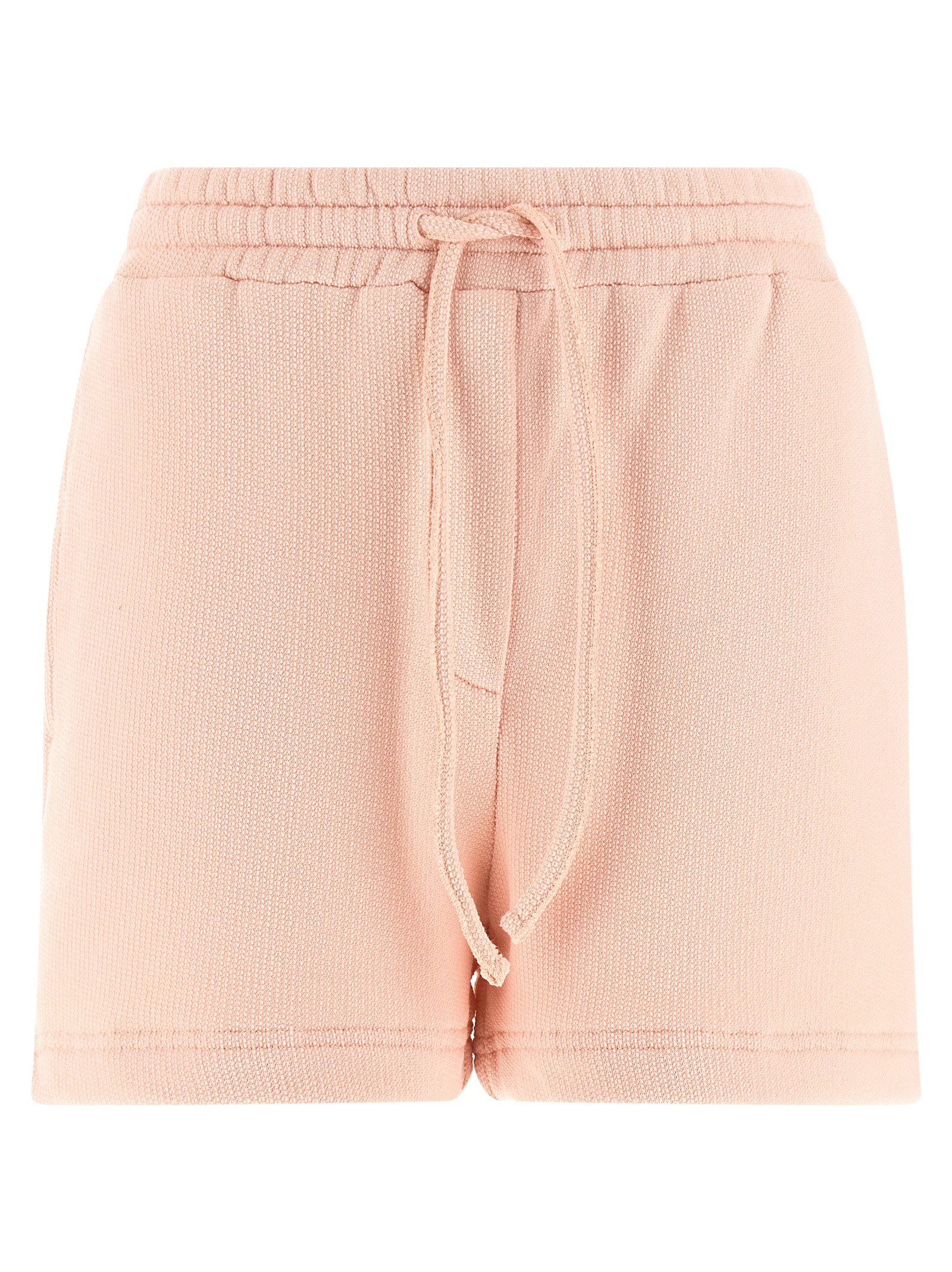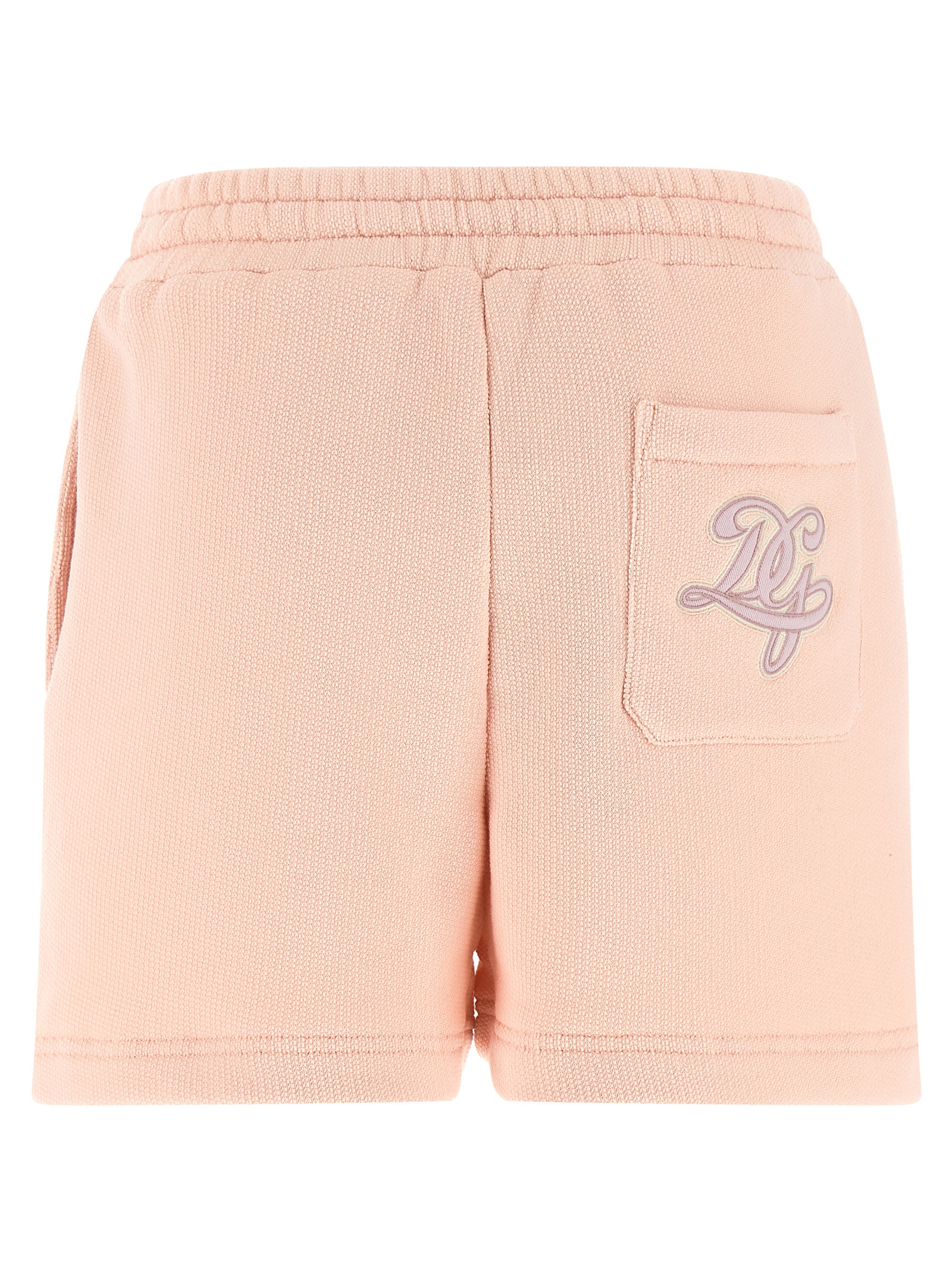 Brushed cotton terry shorts with drawstring elastic waistband, pockets, back logo patch, side slits at the hem.