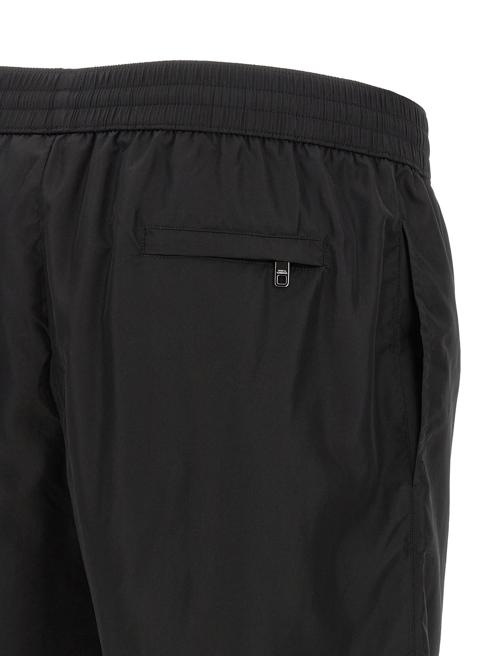 Light nylon swimsuit, medium model, metal plate with front engraved logo, adjustable drawstring elastic at the waist, trompe l’oeil flap, pockets, inner briefs.