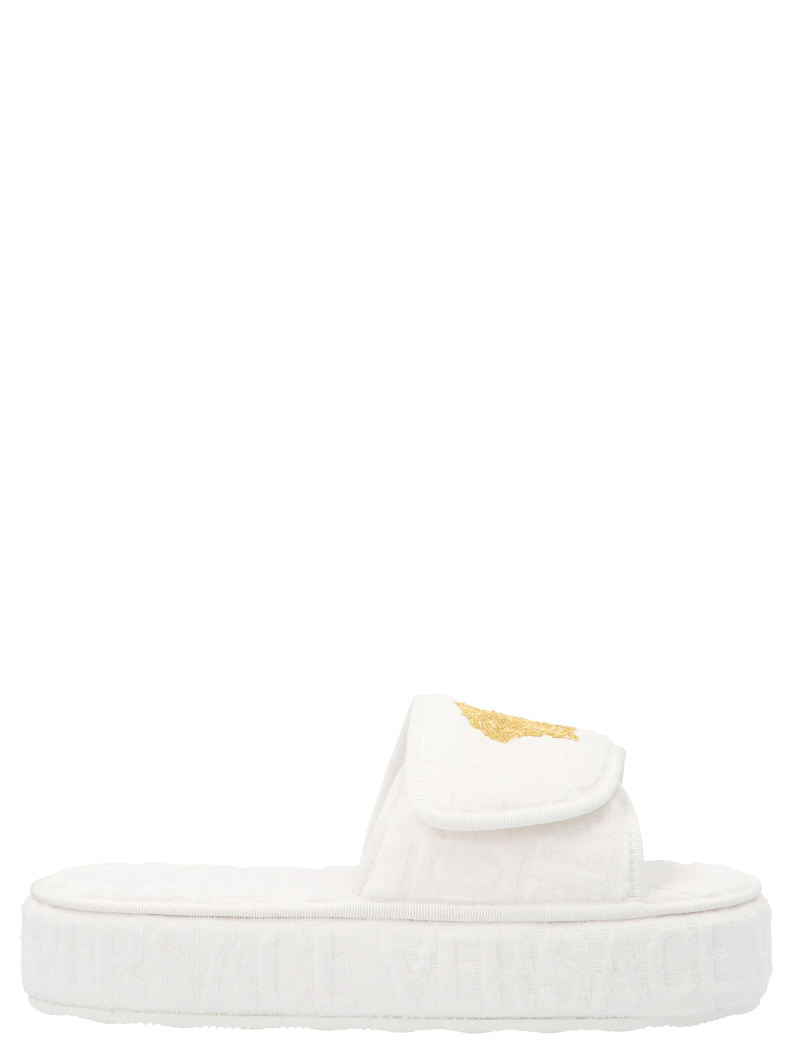 Terry cloth logo slides with a velcro closure and a ‘Medusa’ contrasting logo.