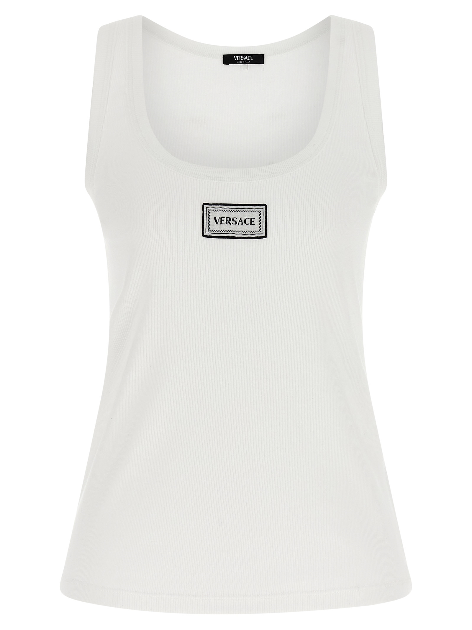 Stretch ribbed cotton top, ‘’90s Vintage Logo’’ jacquard patch on the front, round neckline.