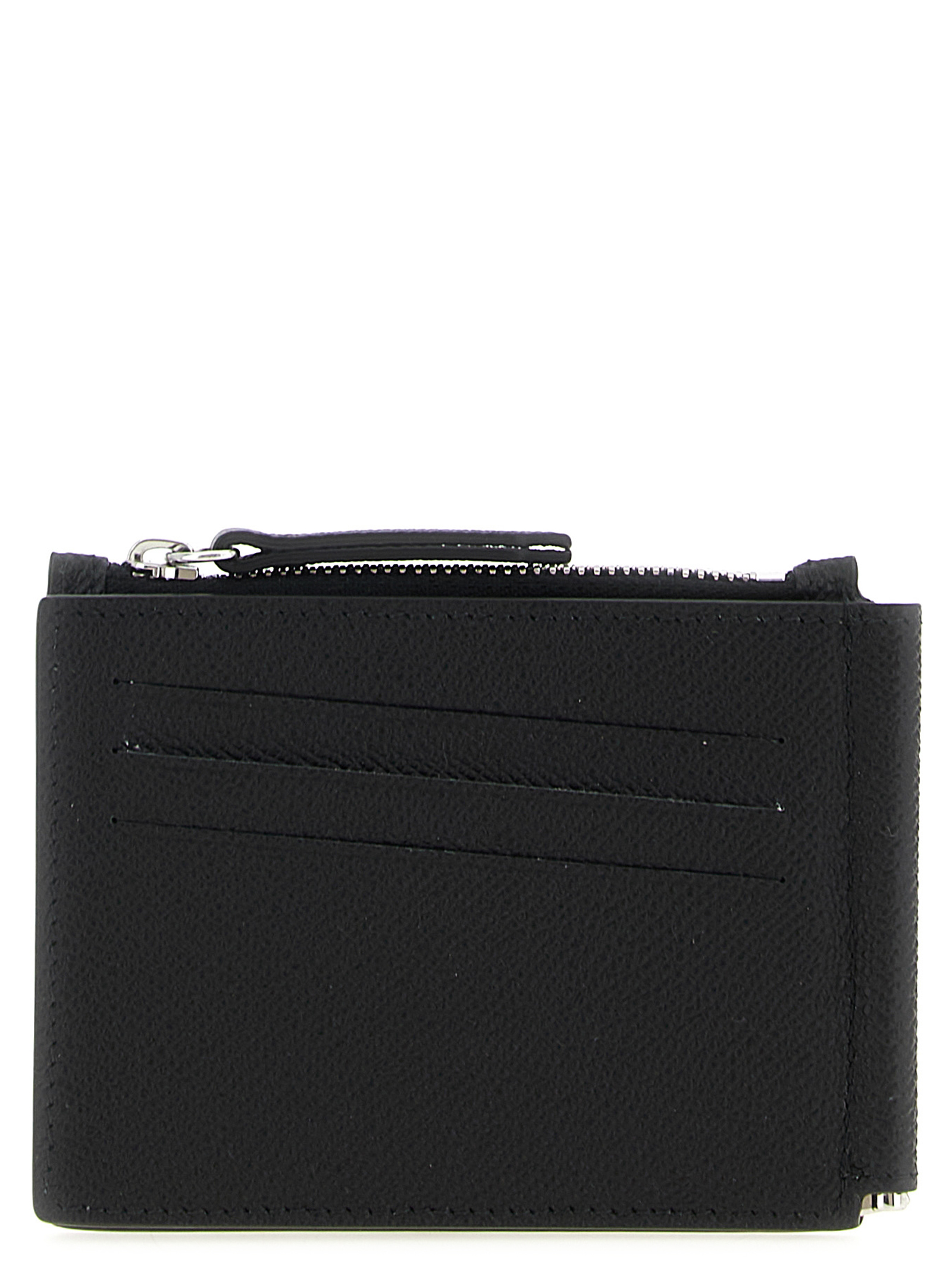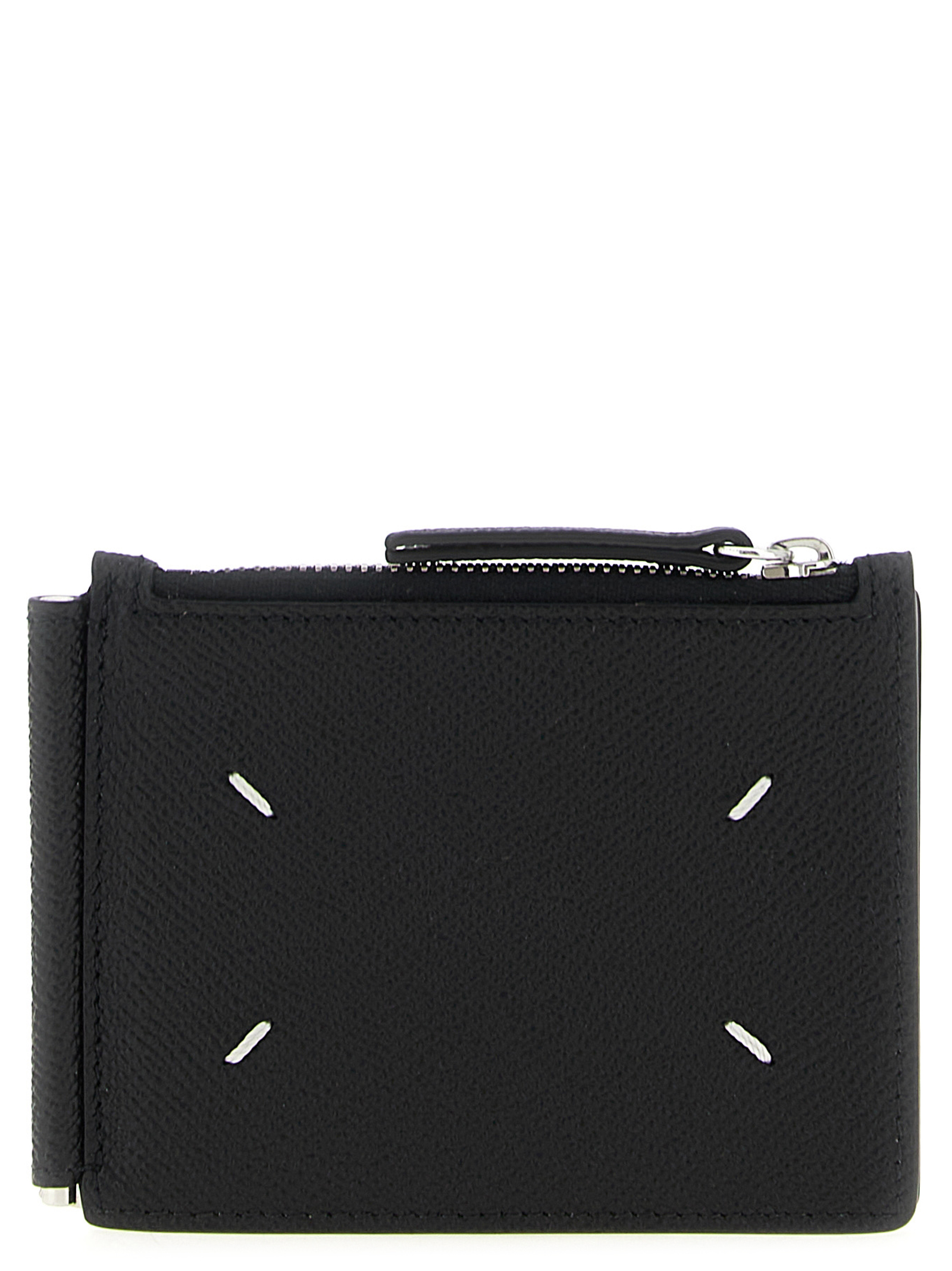 Leather wallet with logo embroidery, top zip and inner metal money clip.