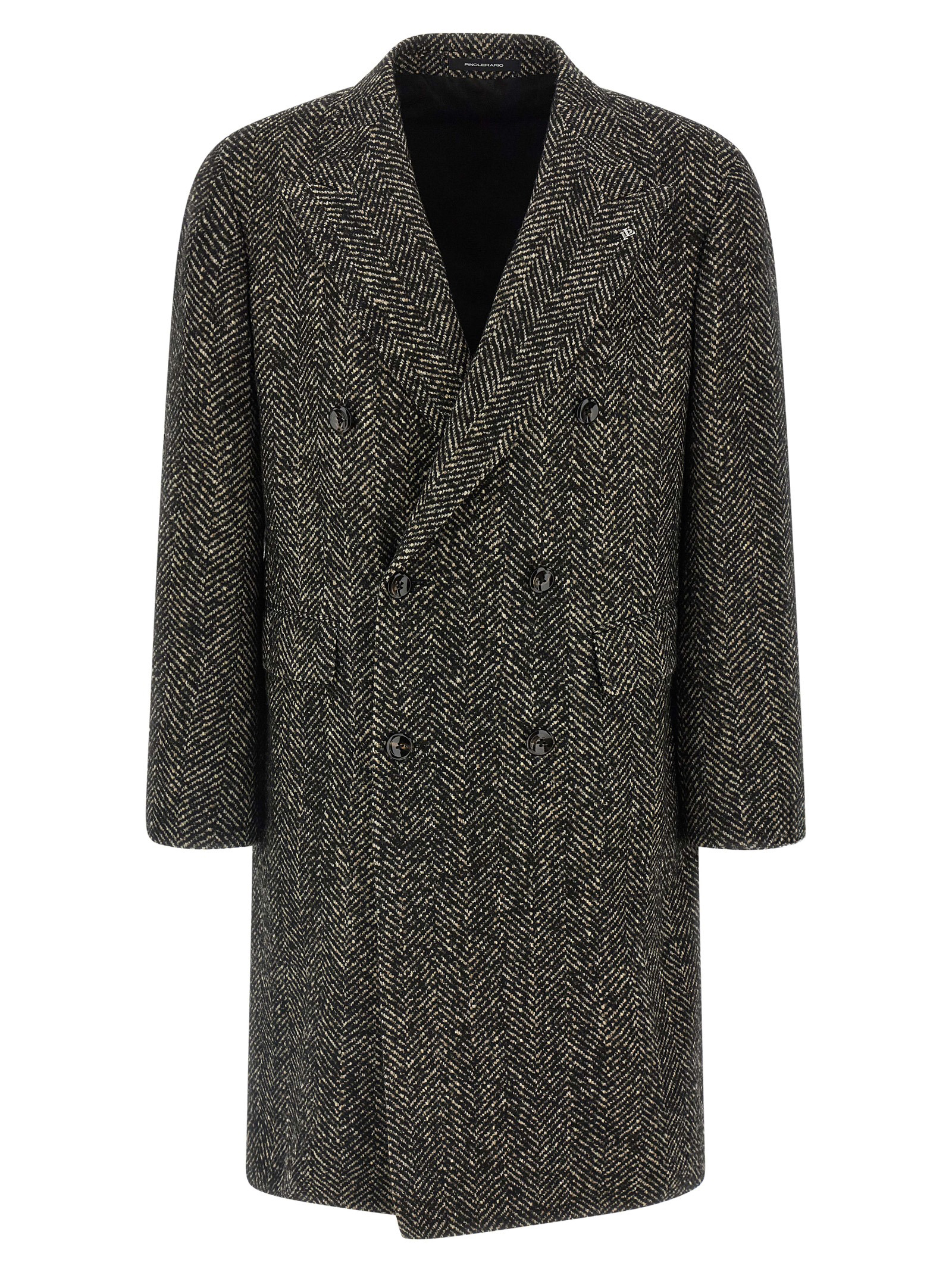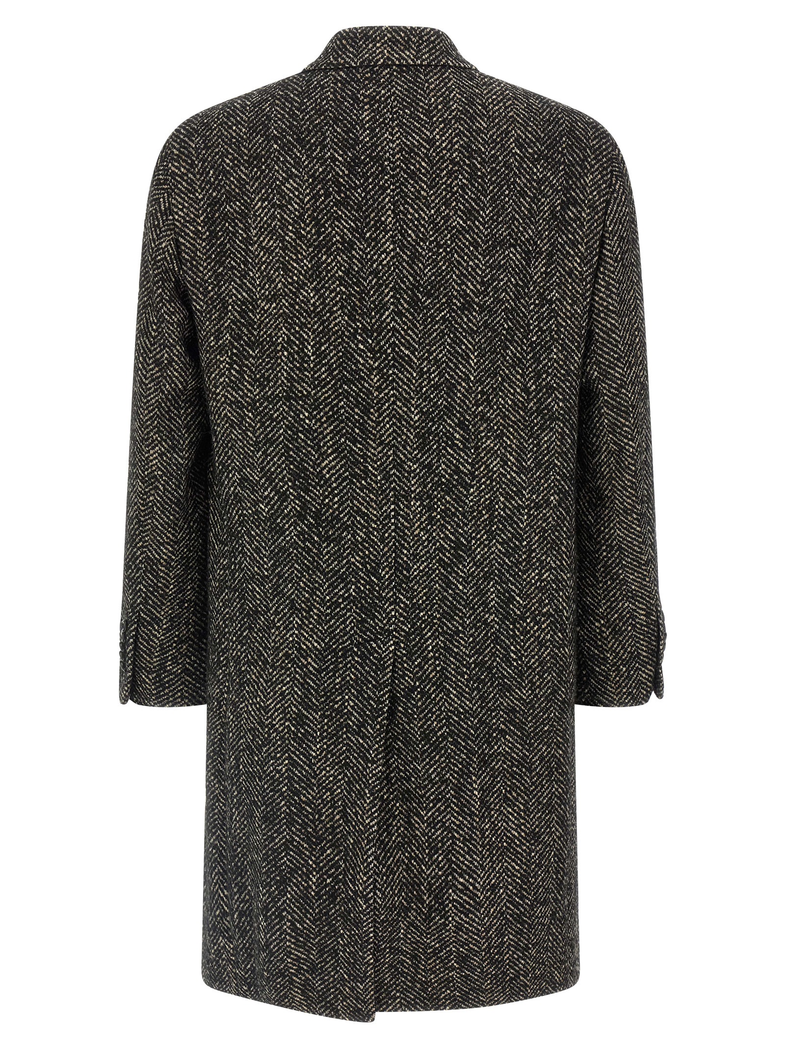 ‘Londra’ double-breasted coat in herringbone wool blend with button closure, peak lapels, flap welt pockets, back central split.