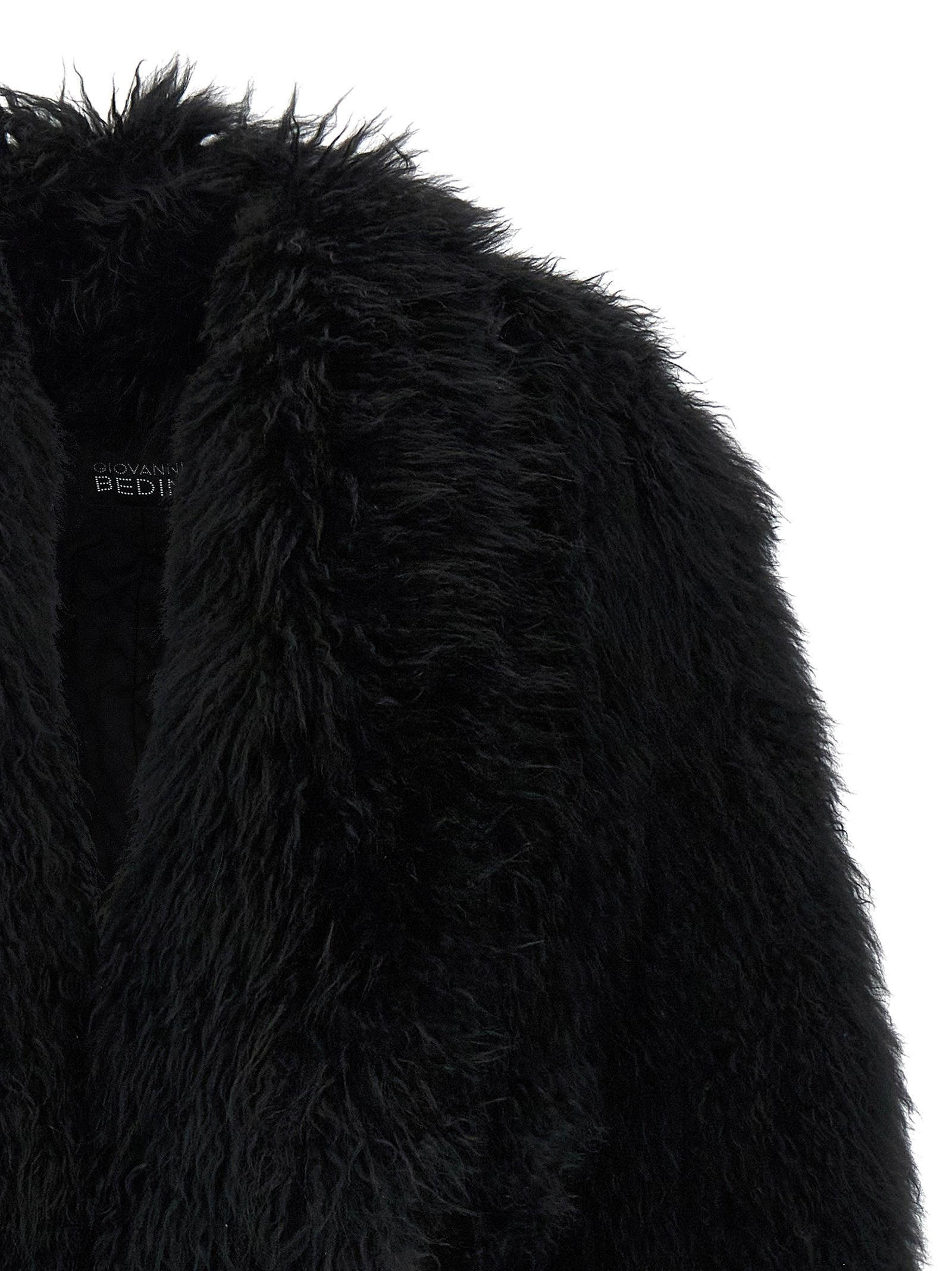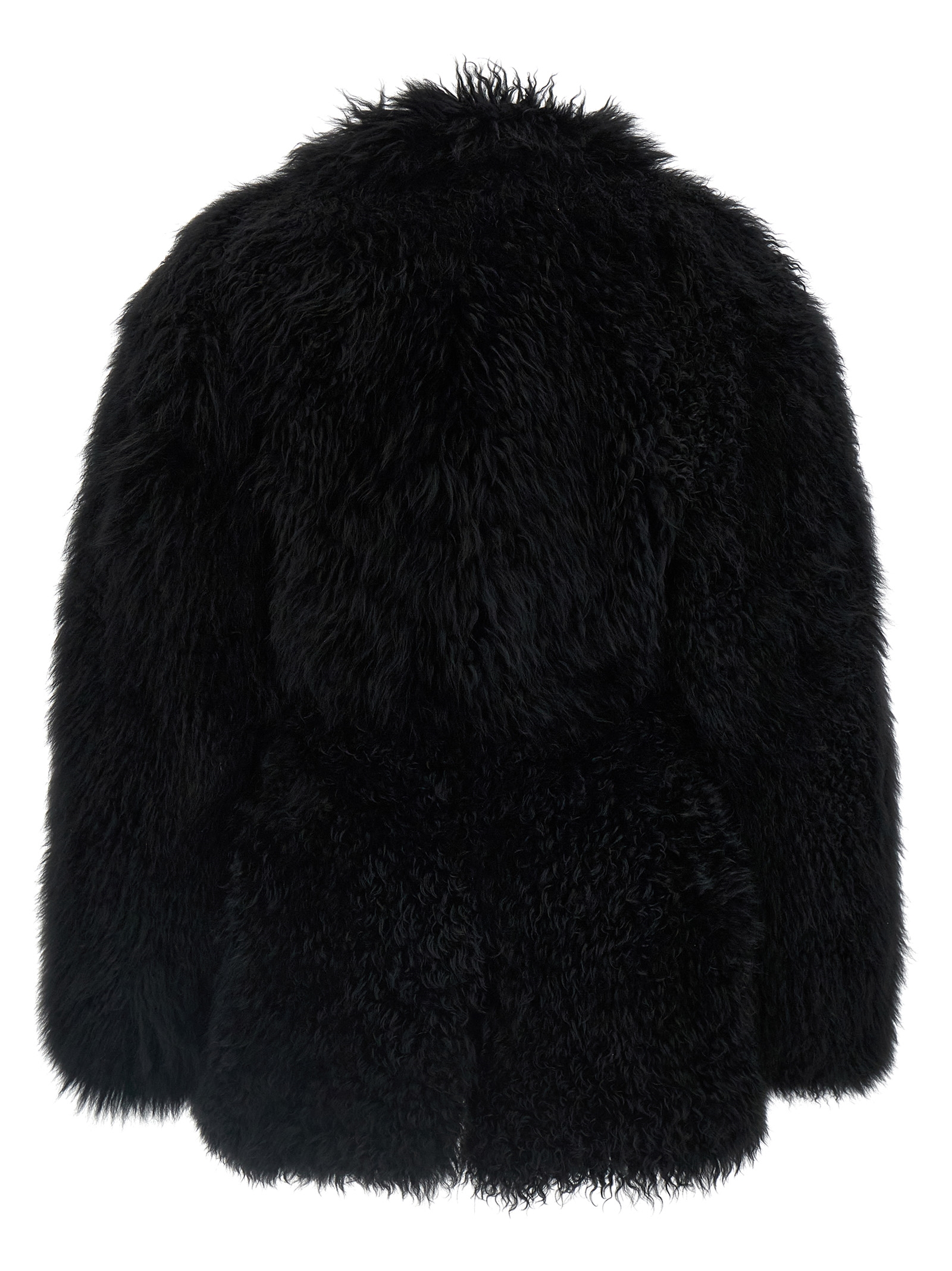 Long-haired fur, shawl collar, pockets, long sleeves, belt at the waist, quilted tone-on-tone cotton lining.