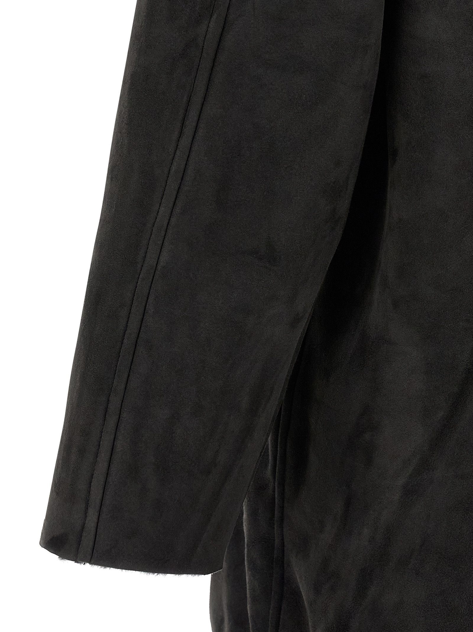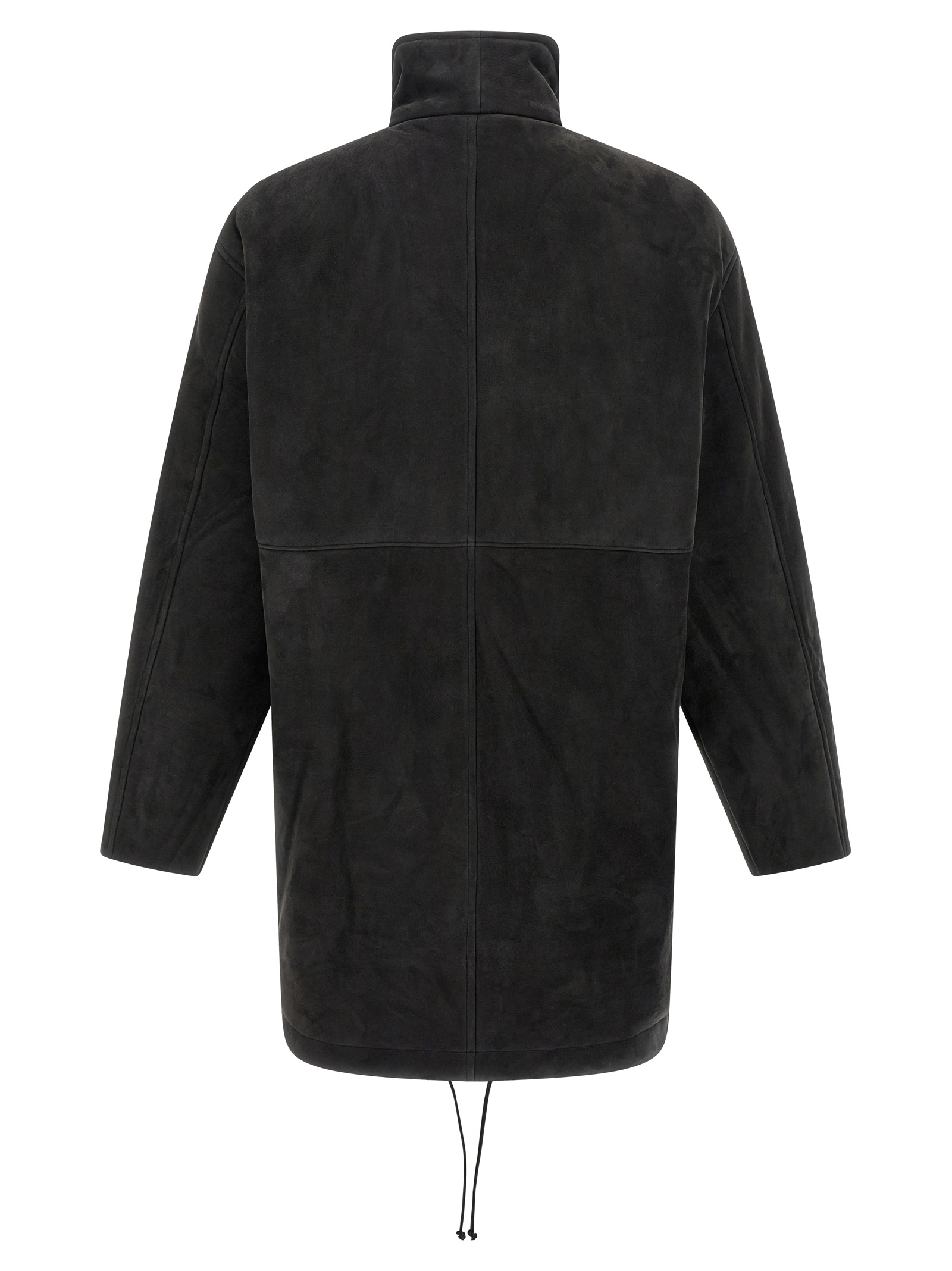 Long suede sheepskin jacket with shearling lining, high neck, front zip closure, pockets, long sleeves with raw cut hem and drawstring at the hem.