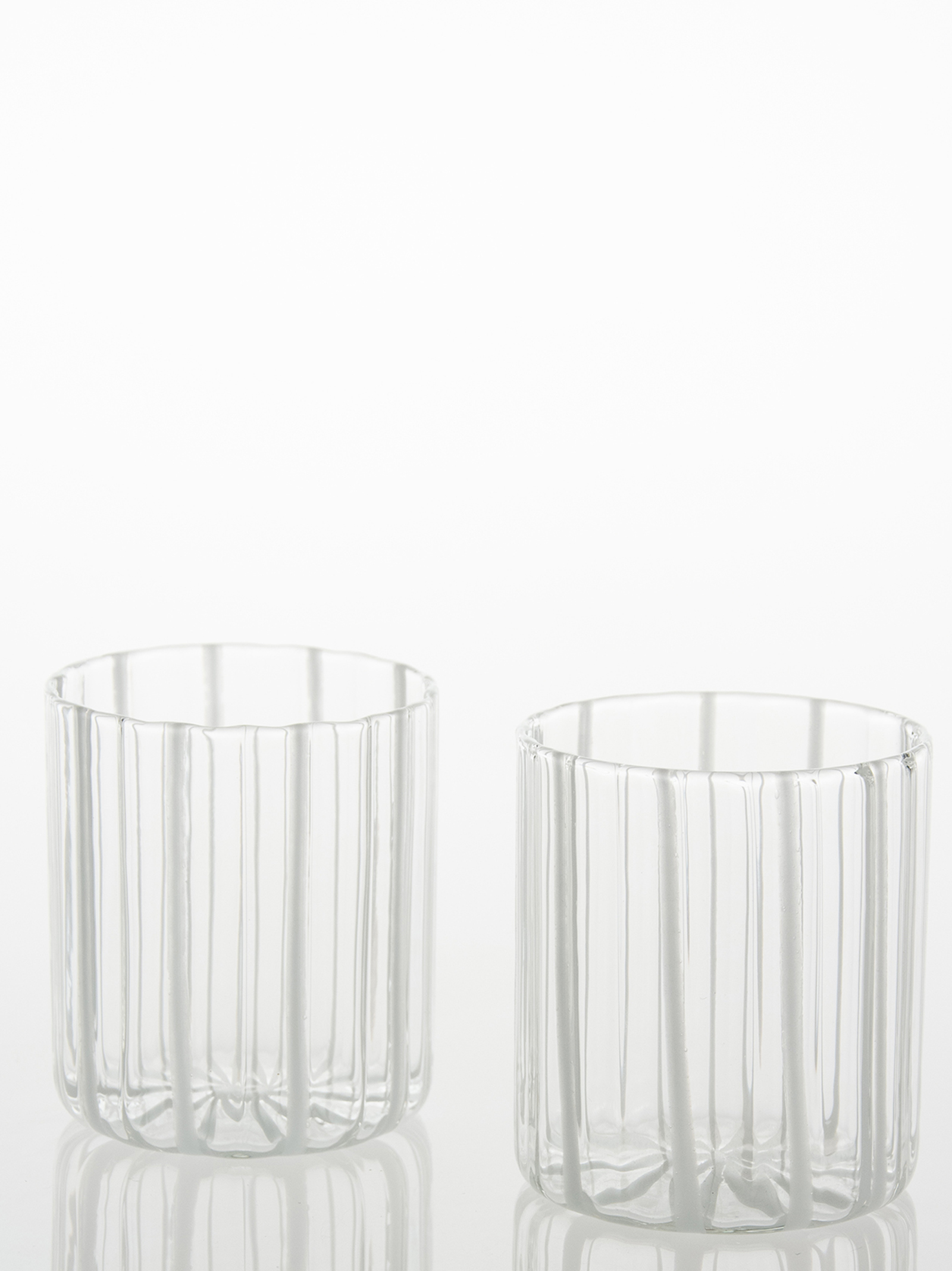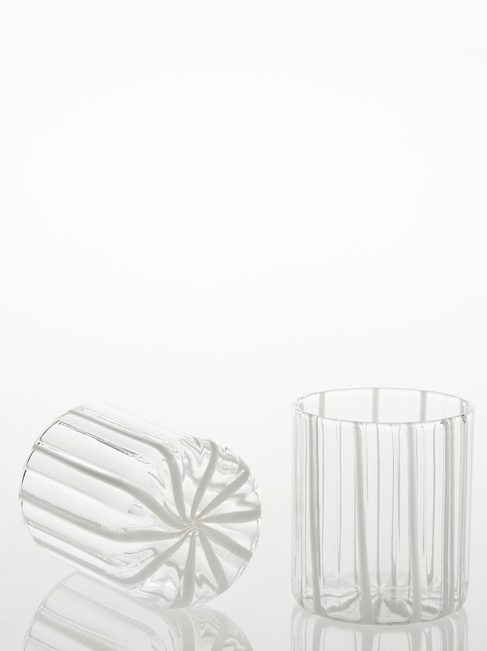 ‘Loos’ glass in handcrafted mouth-blown glass. Decorated manually with glass rods in different shades cast tip, to the flame.