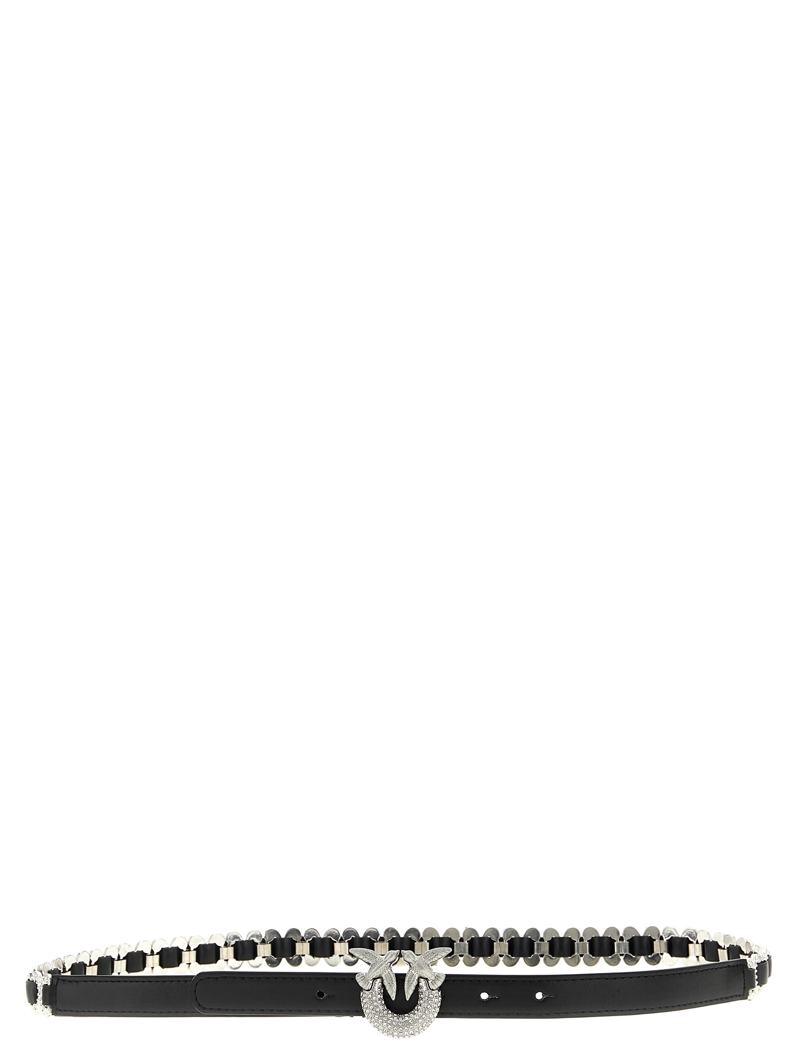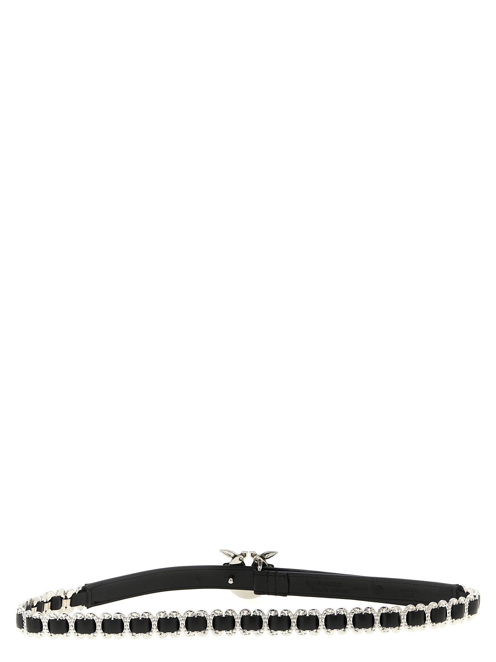 Leather belt with metal details, metal ‘Love Birds’ buckle with rhinestone appliqué.