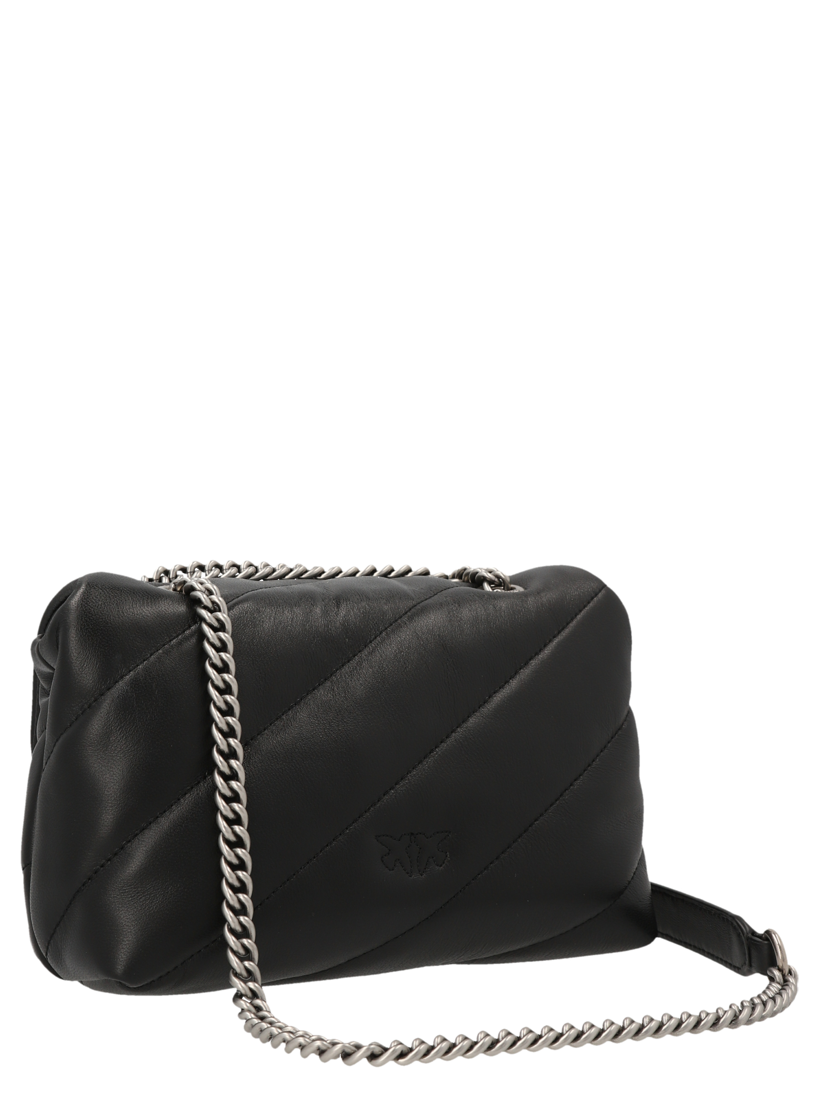 ‘Mini Love Puff’ crossbody bag in nappa leather with large diagonal quilting, magnetic flap closure with iconic ‘Love Birds Diamond Cut’ metal buckle, suede microfiber lining, sliding chain shoulder strap with nappa leather shoulder pad.