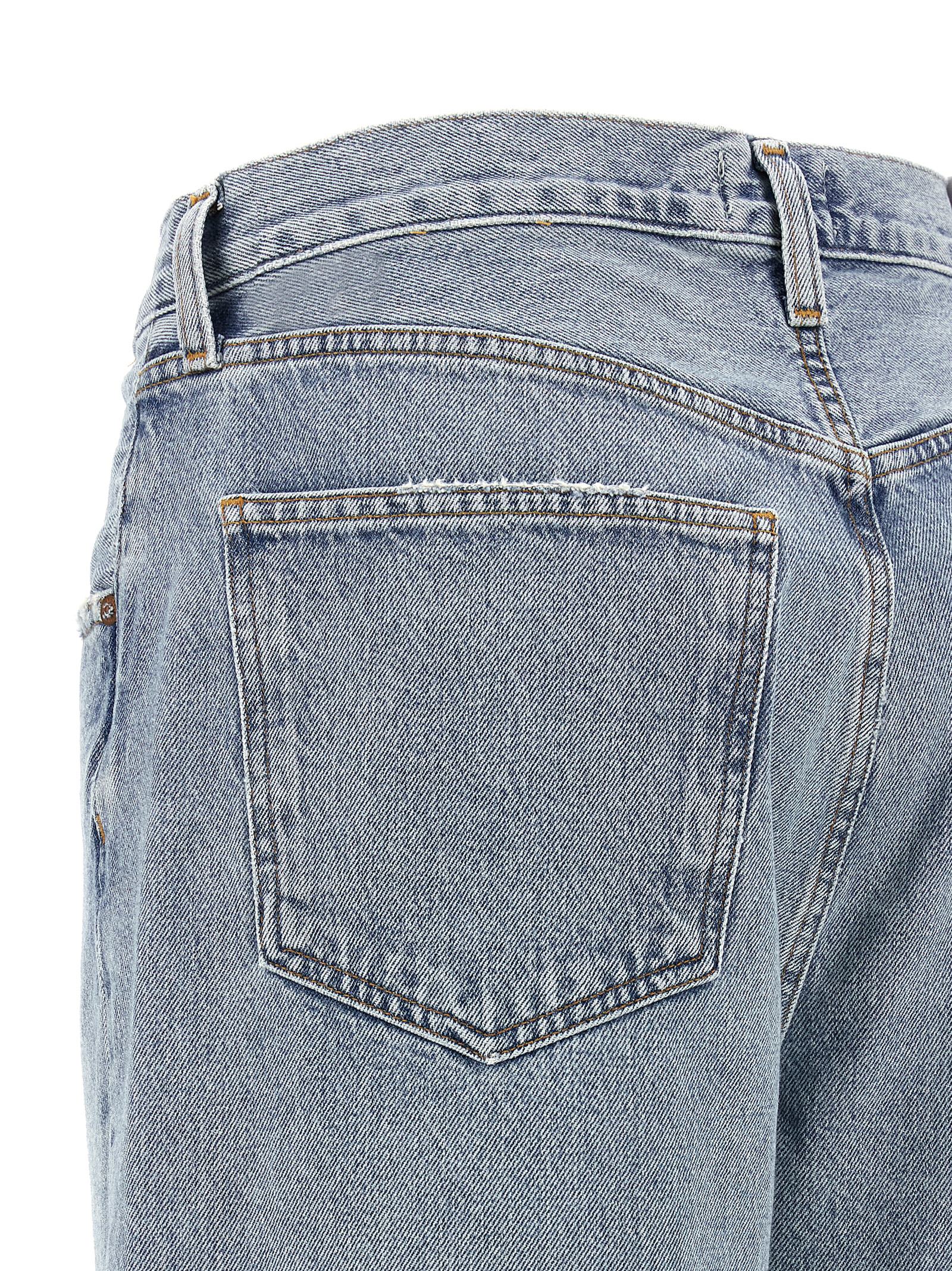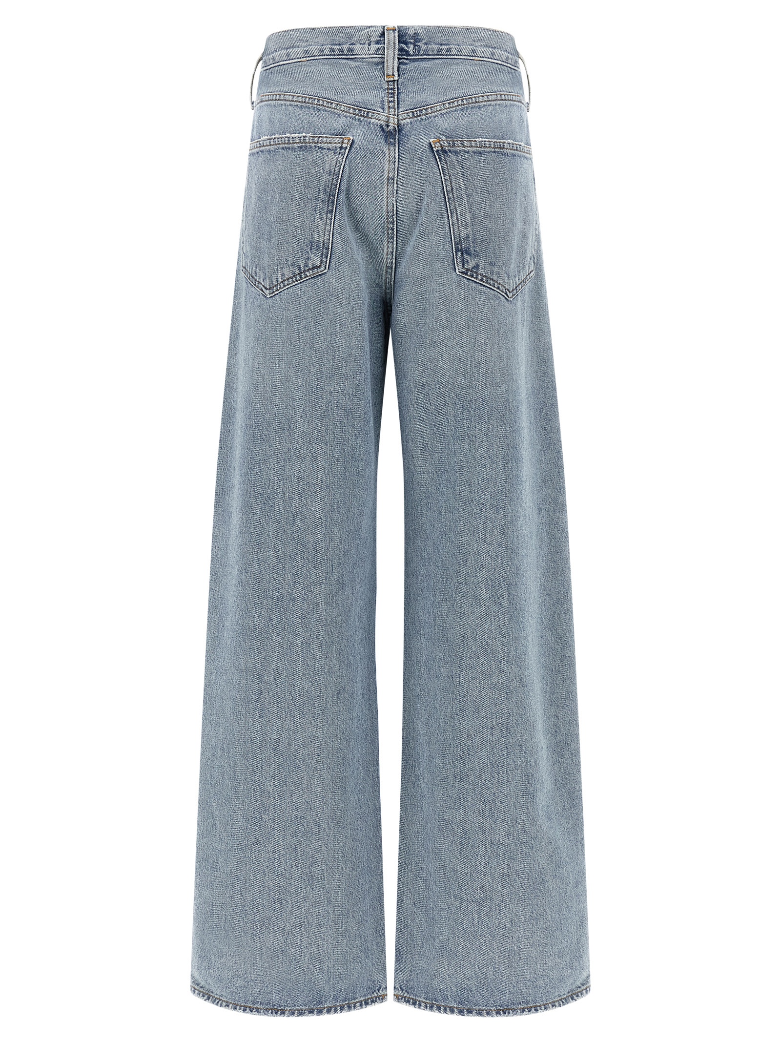 ‘Low Curve’ vintage marbled light indigo denim jeans with discoloration and whiskering, mid waist, slightly tapered wide leg, zip and front button closure, five pockets.
