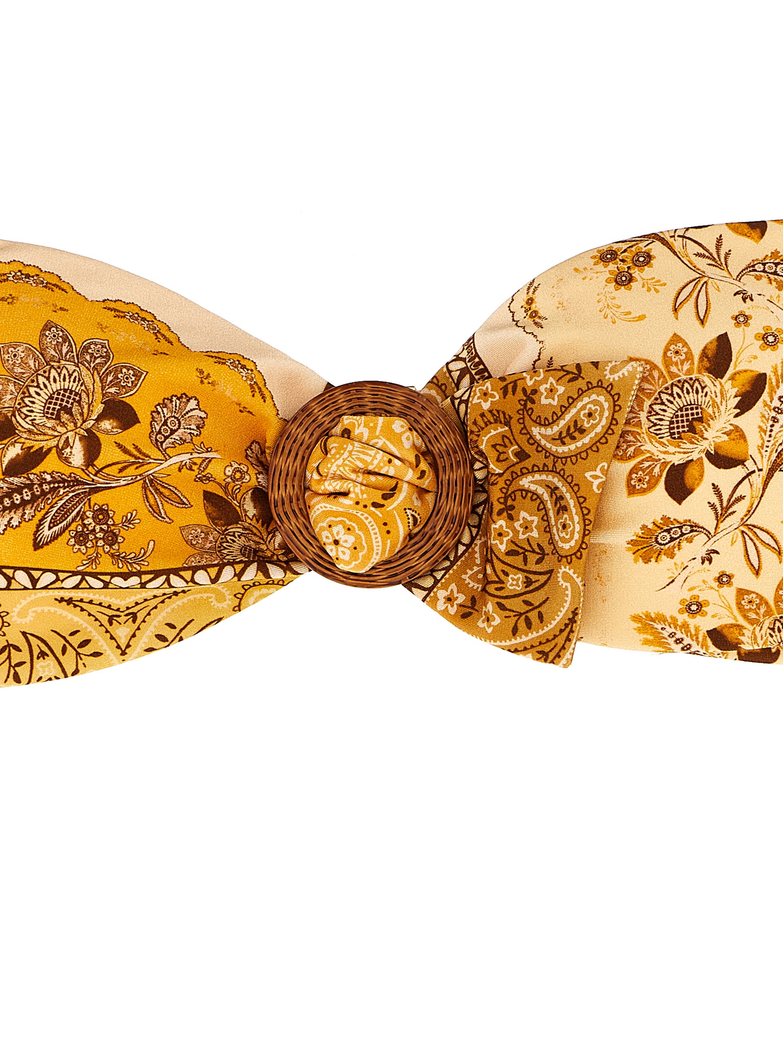 Bandana-print ‘Lucky Ring’ bikini, slightly padded bandeau top with bamboo-effect circular front buckle detail, automatic back closure, low-waisted briefs.