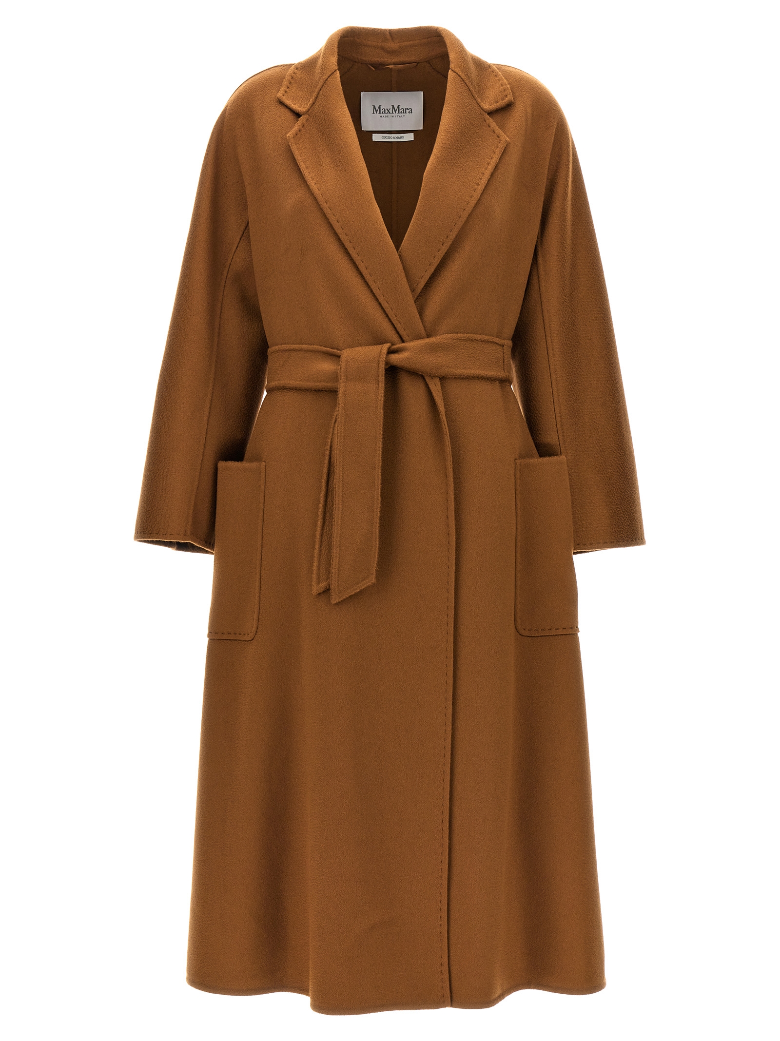 Long ‘Ludmilla – Icon Coat’ coat in double drap of hand-stitched sable cashmere finished with tailored dot, robe style, pockets, long kimono sleeves at the front and raglan at the back, and removable belt.