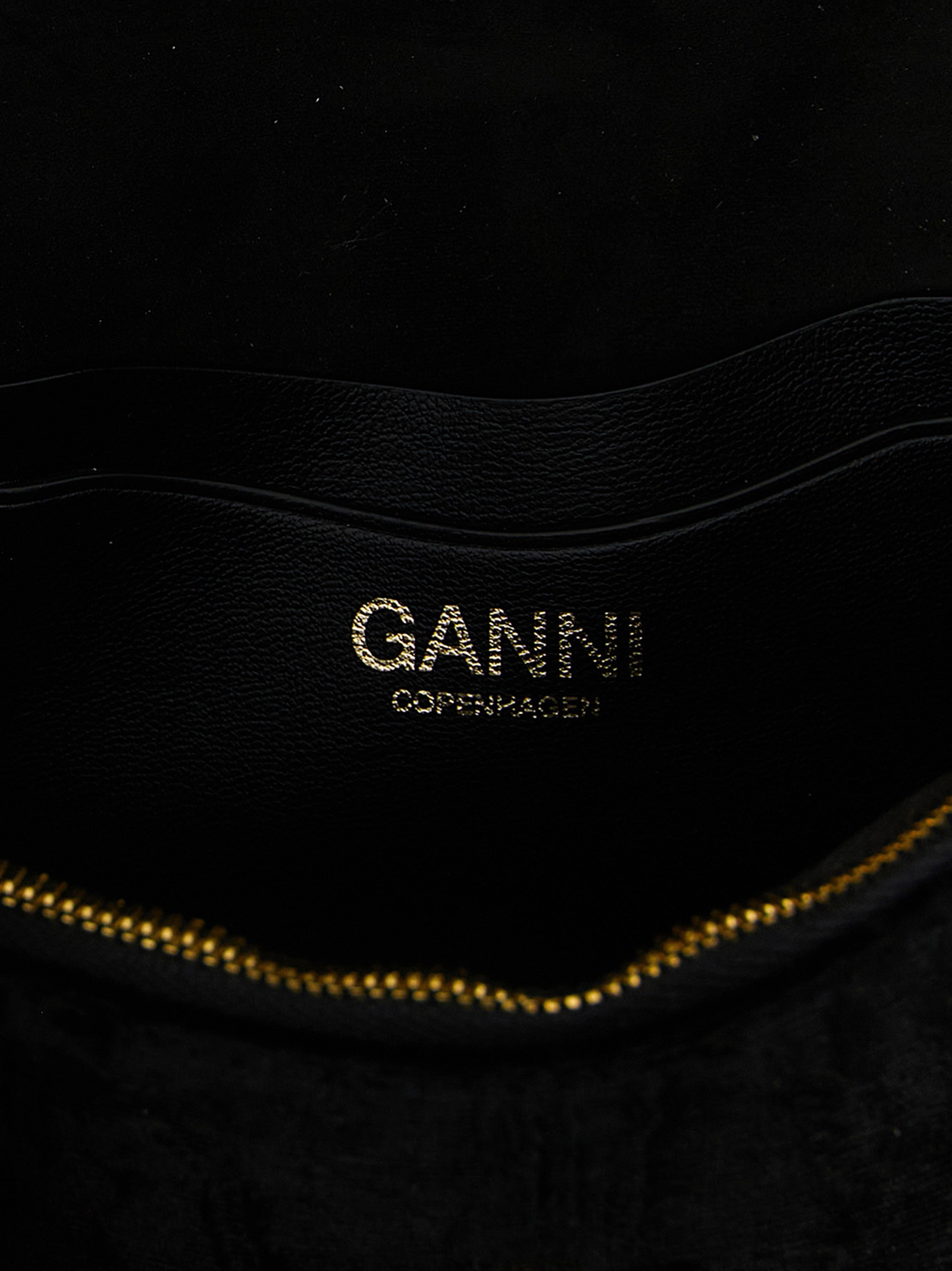 ‘Lulu’ moiré velvet wallet On Chain, magnetic flap closure with metal ‘GANNI Butterfly’ logo on the front, removable chain shoulder strap.