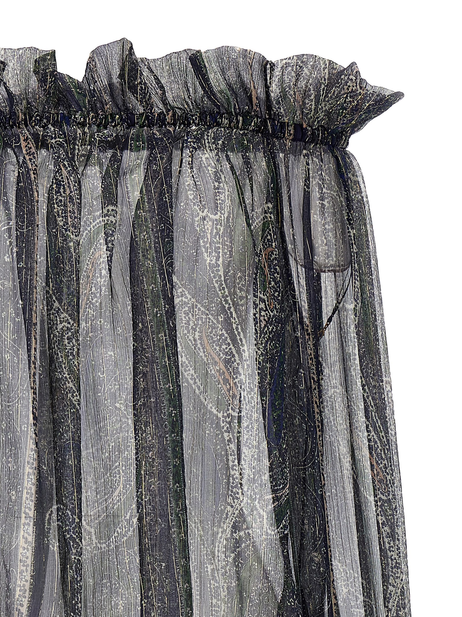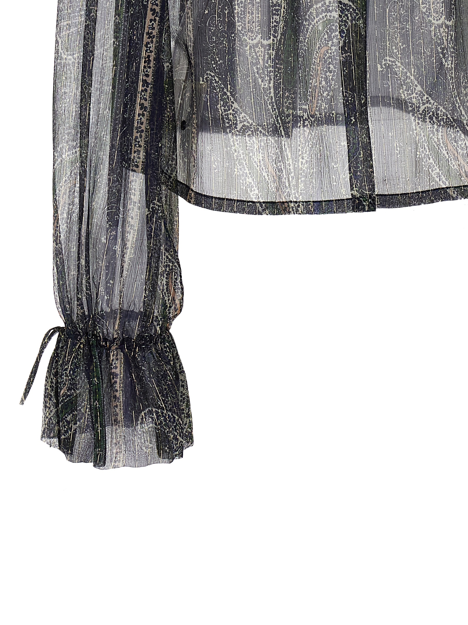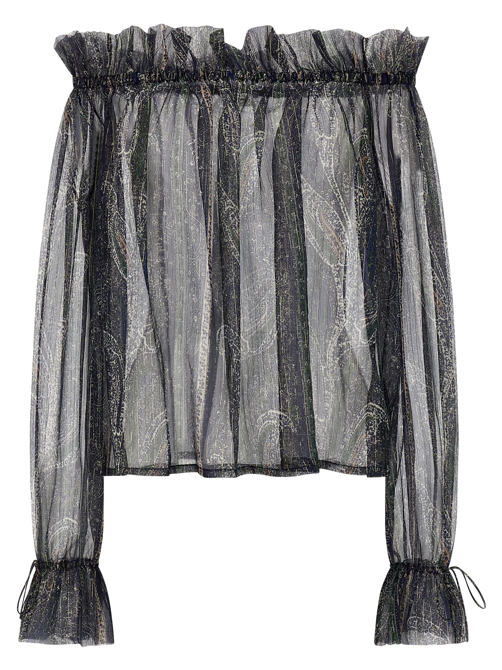 Paisley motif silk crépon blouse in lurex, off-the-shoulder model, ruffled collar, long sleeves with poet cuffs with drawstring.