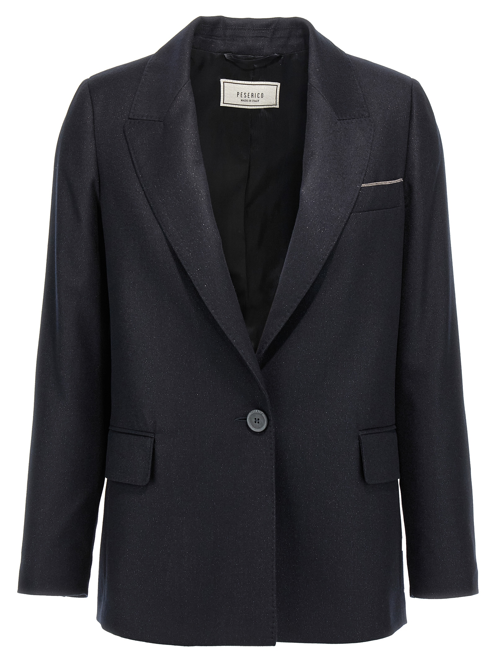 Single-breasted virgin wool flannel blazer with lurex yarns with front button closure, viscose lining, pocket with metal detail, mirror lapels, flap pockets, structured shoulder strap, long sleeves, back vent.