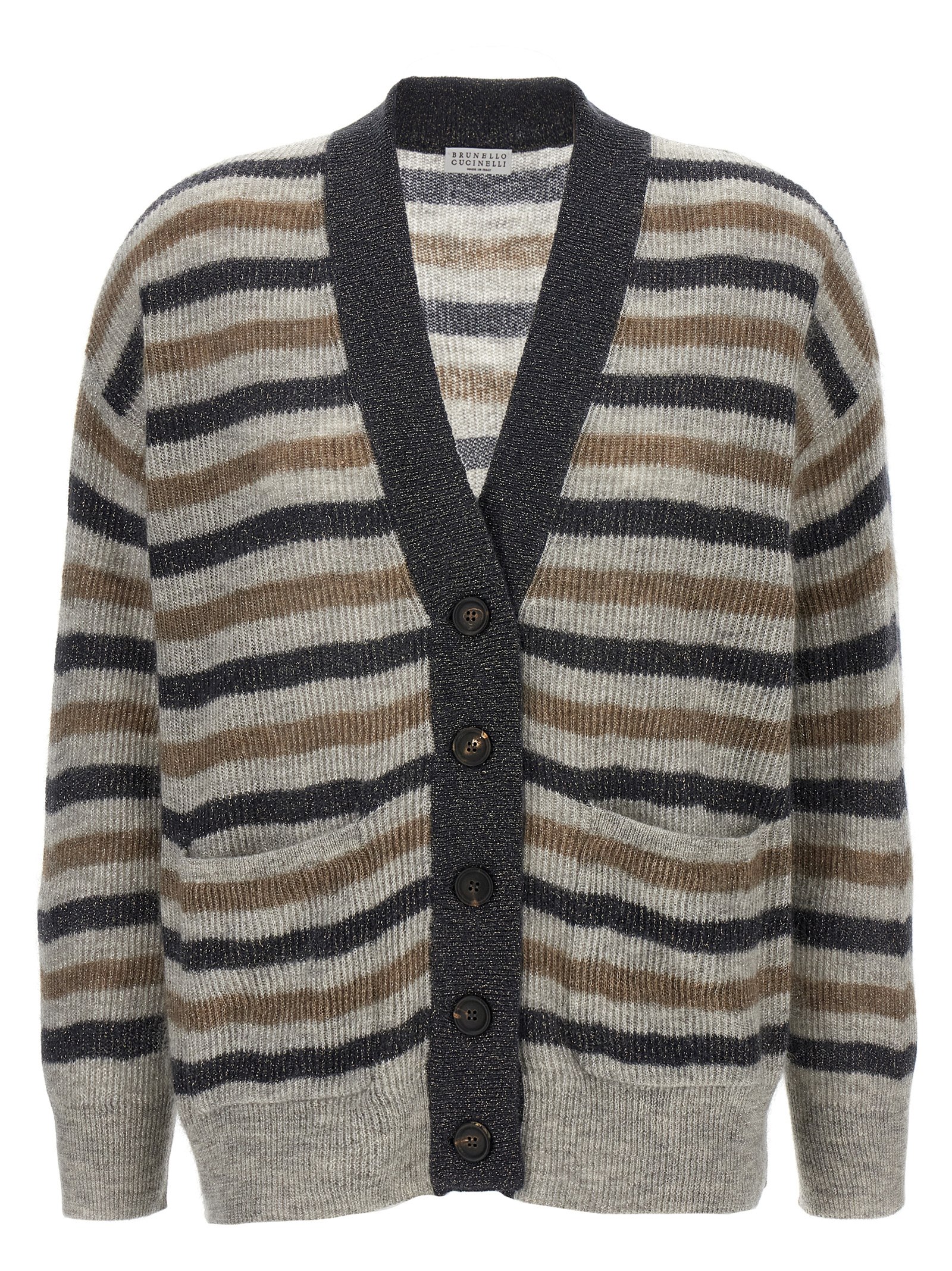 Striped wool blend cardigan with lurex threads, V-neck, front button closure, pockets, long sleeves with cuffs and dropped shoulders.