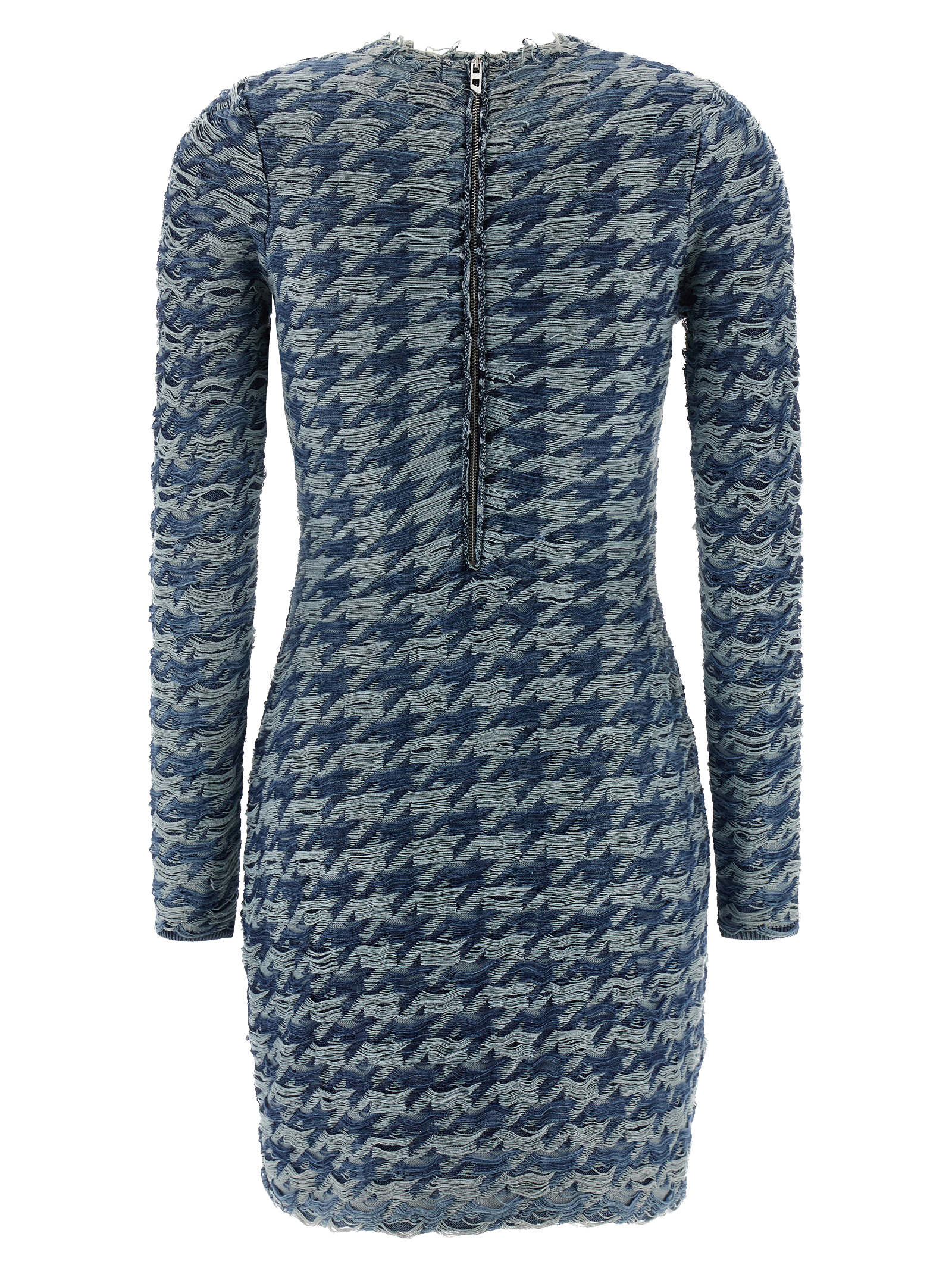Mini ‘M-Halma’ laser-cut cotton dress to create a houndstooth pattern with burnt effect details and floating threads, crew neck, back zip closure, long sleeves.