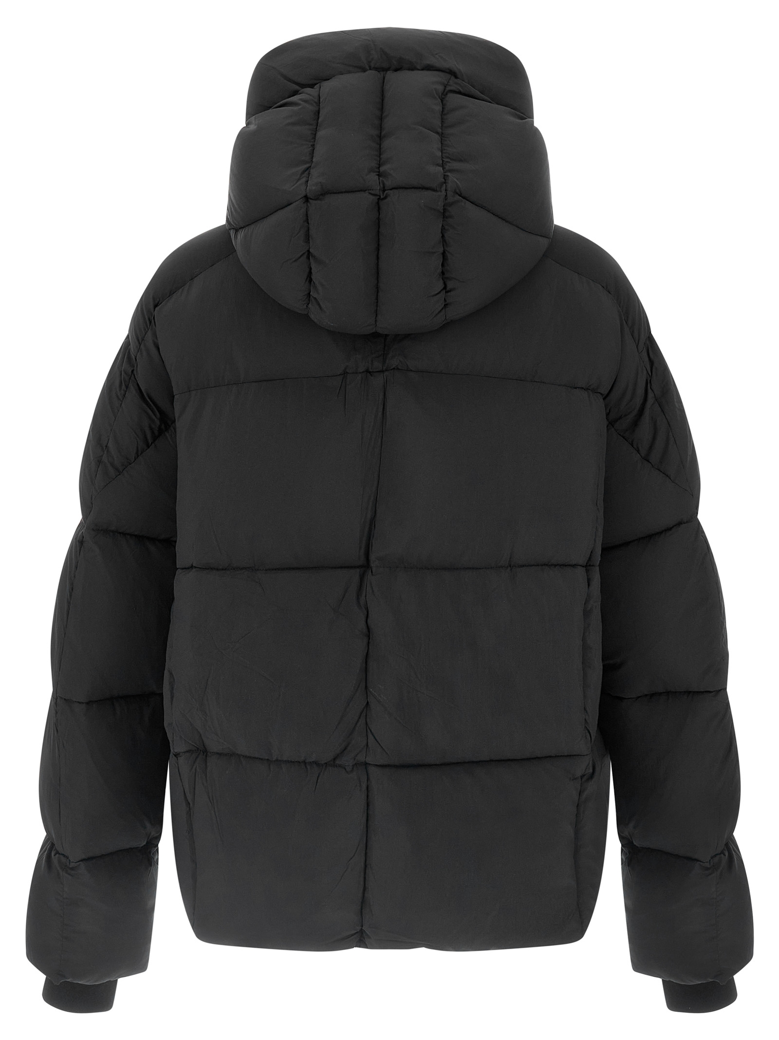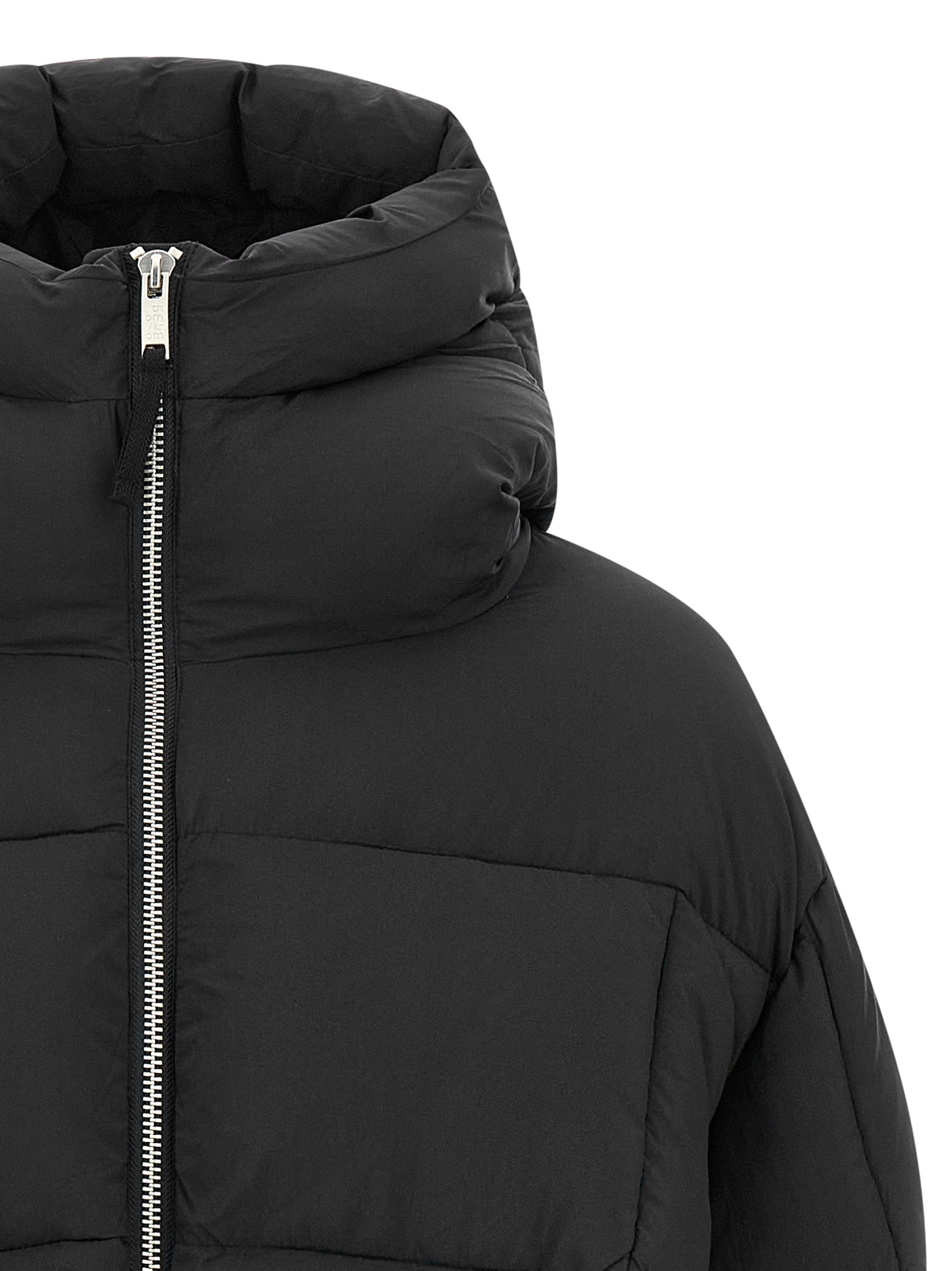 ‘M J 78’ water-repellent and padded quilted nylon down jacket, hood, high neck, front zip closure, pockets, long sleeves with knitted cuffs, drawstring on asymmetrical hem.