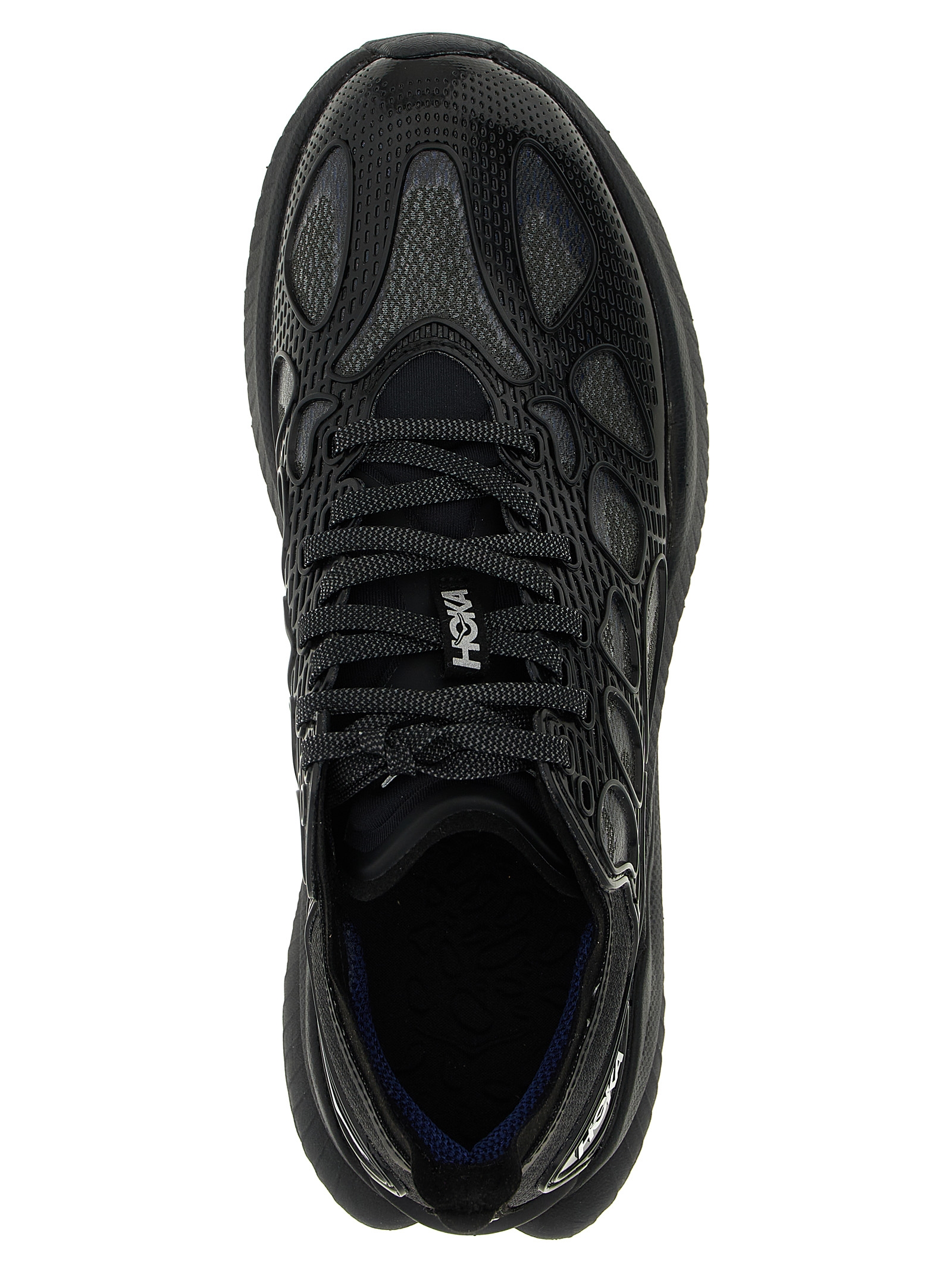 ‘Mach X Caged’ translucent mesh sneakers with flow-molded cage, high resilience PEBA foam, MetaRocker™ near the instep, non-slip rubber sole.