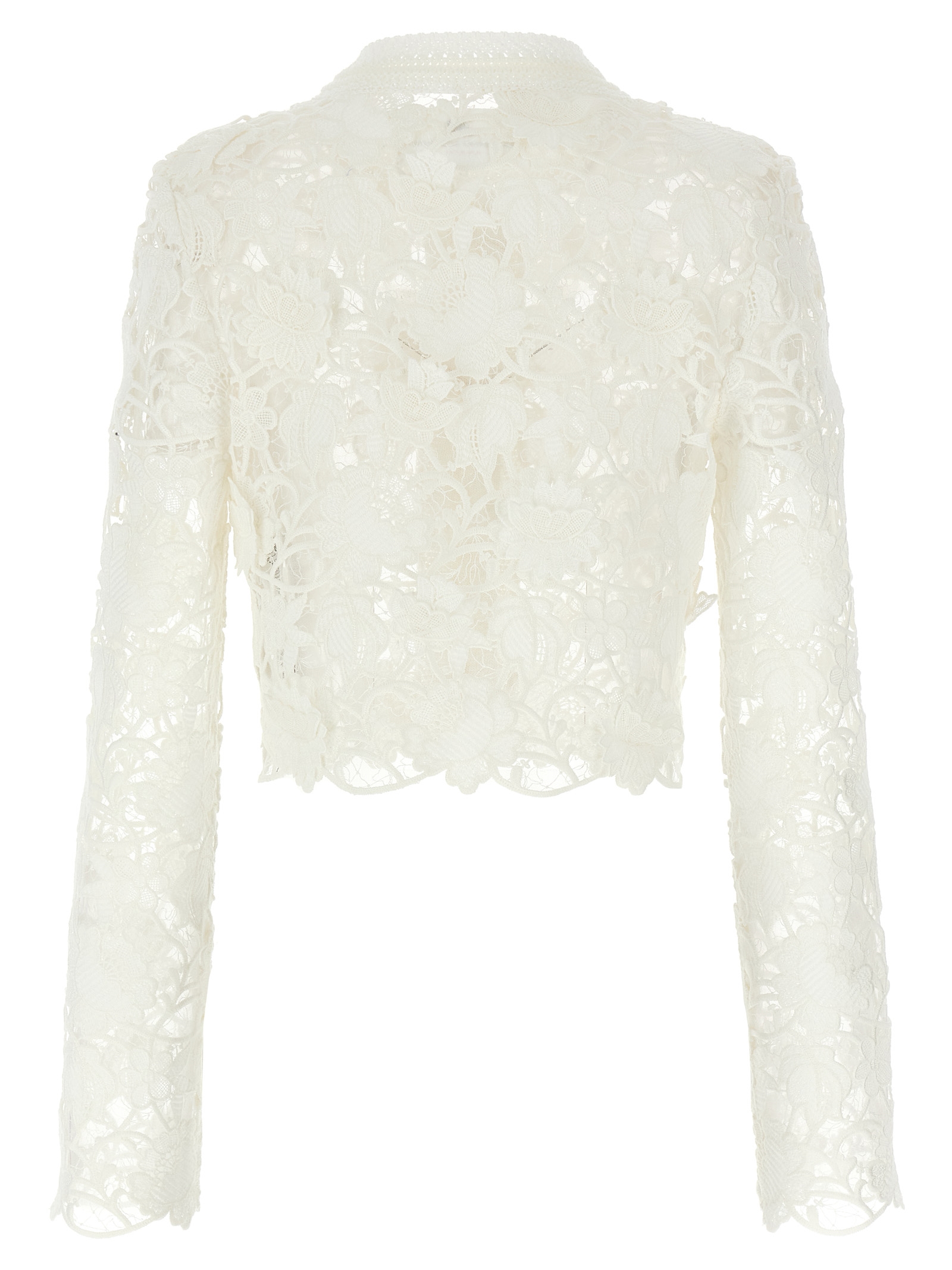 Cardigan in macramé lace and transparent tulle with floral motif, crop model, crew neck, long sleeves.
