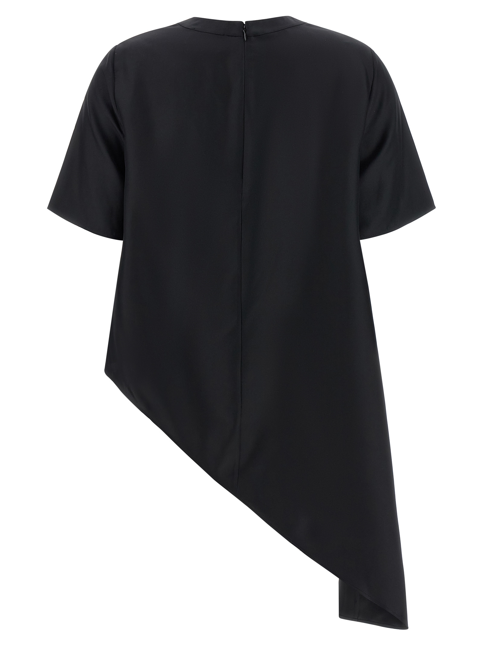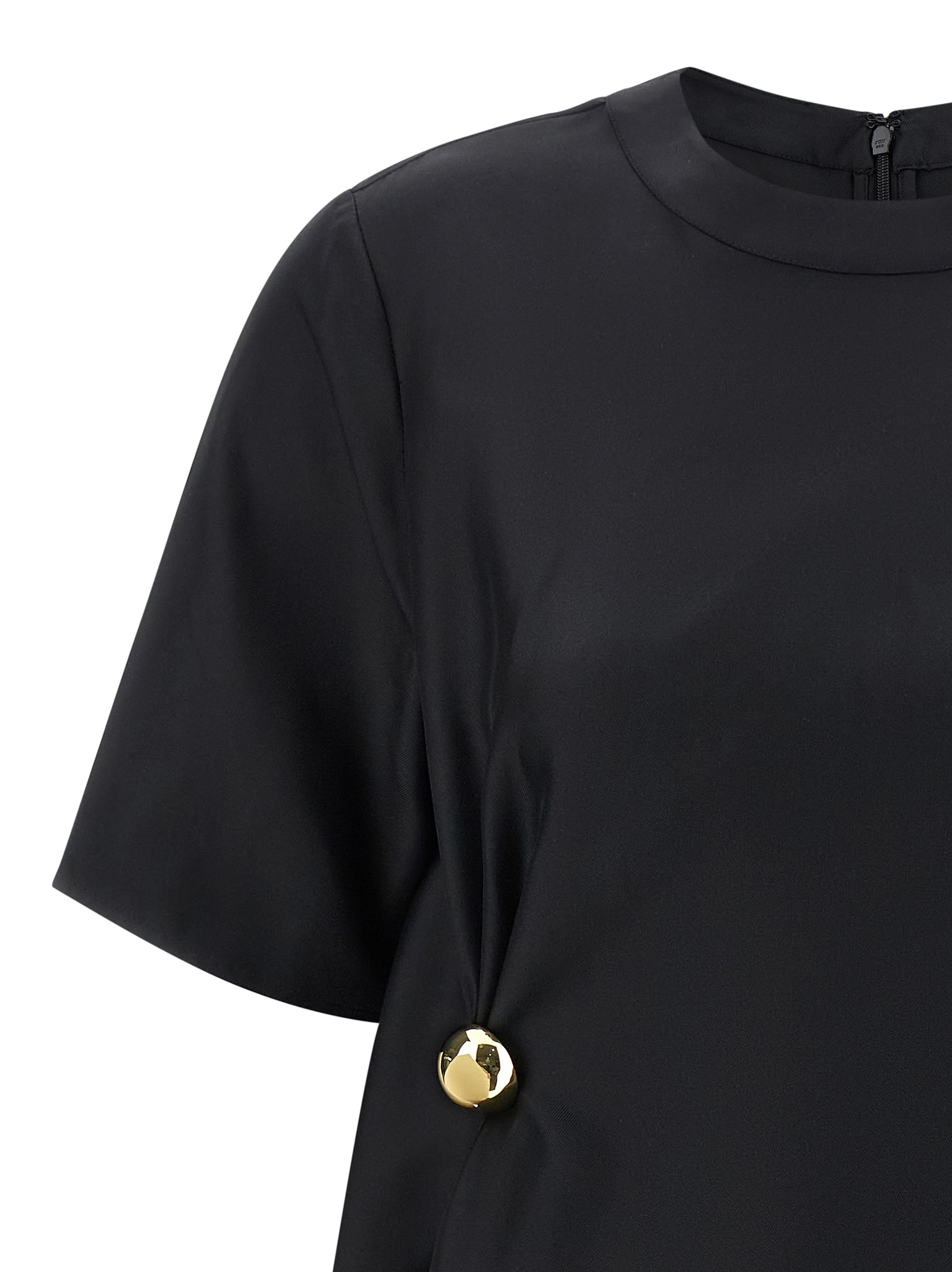 ‘Madea’ silk twill top with trapezoid silhouette, side draping thanks to metal detail, crew neck, back zip closure, short sleeves, asymmetrical hem.