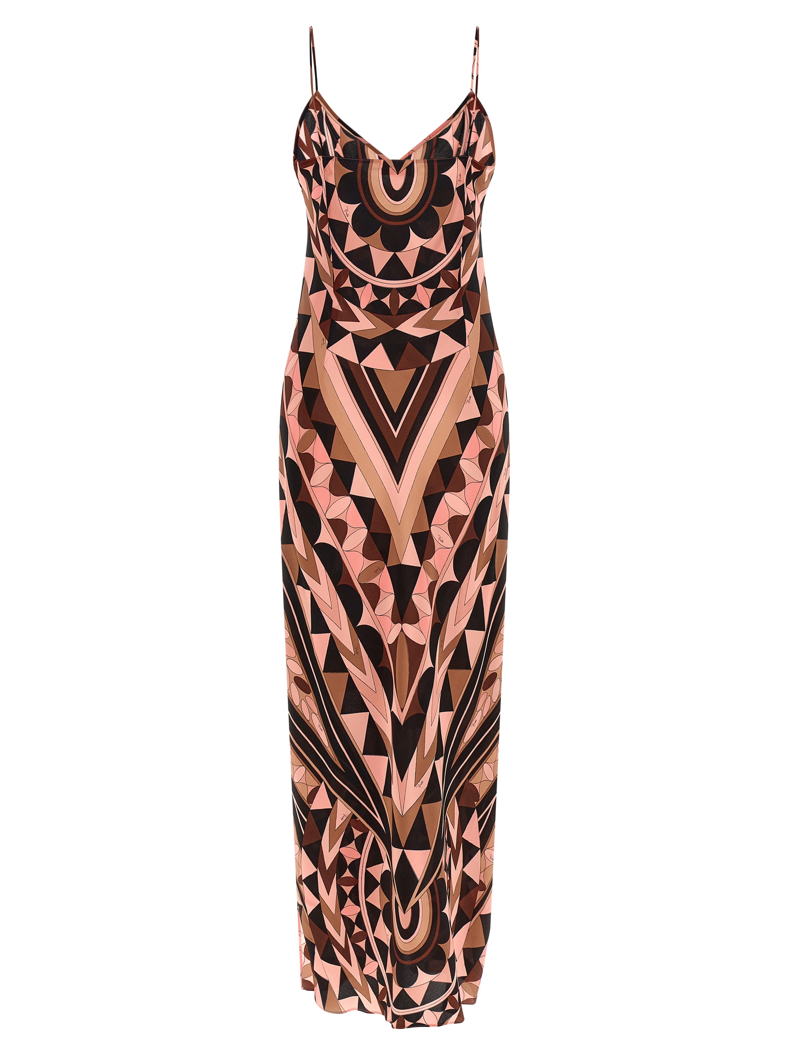 All over crepe de chine silk dress with Manuba print, petticoat style with thin straps, front and back neckline, straight style with side split.