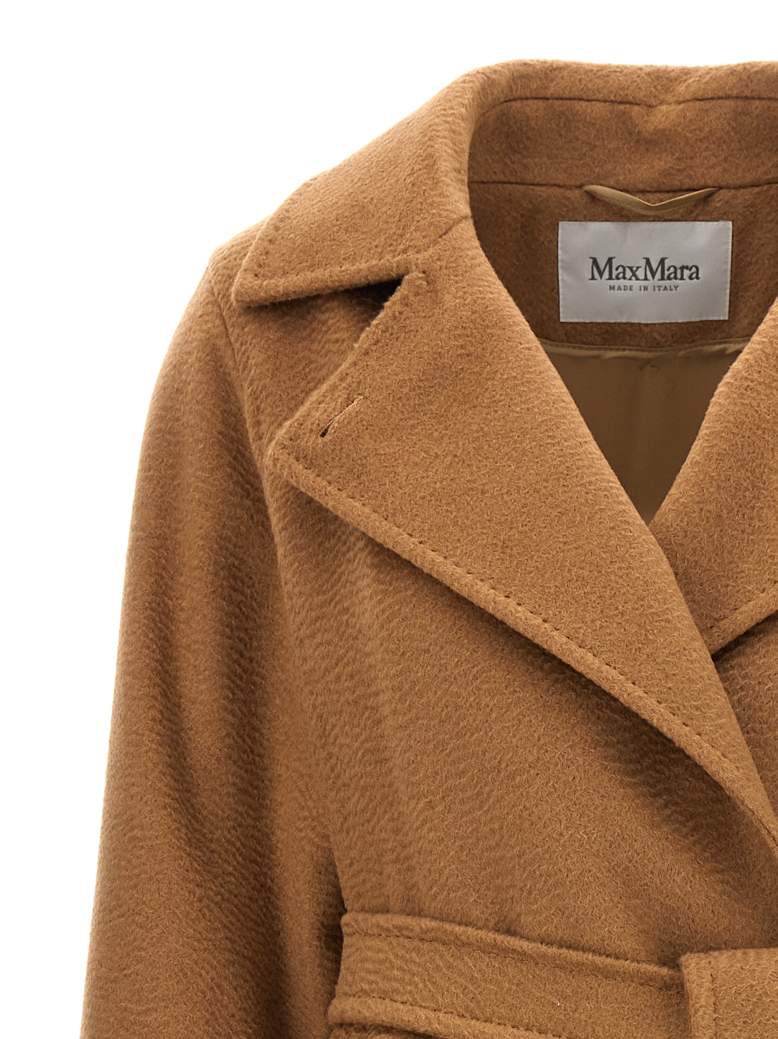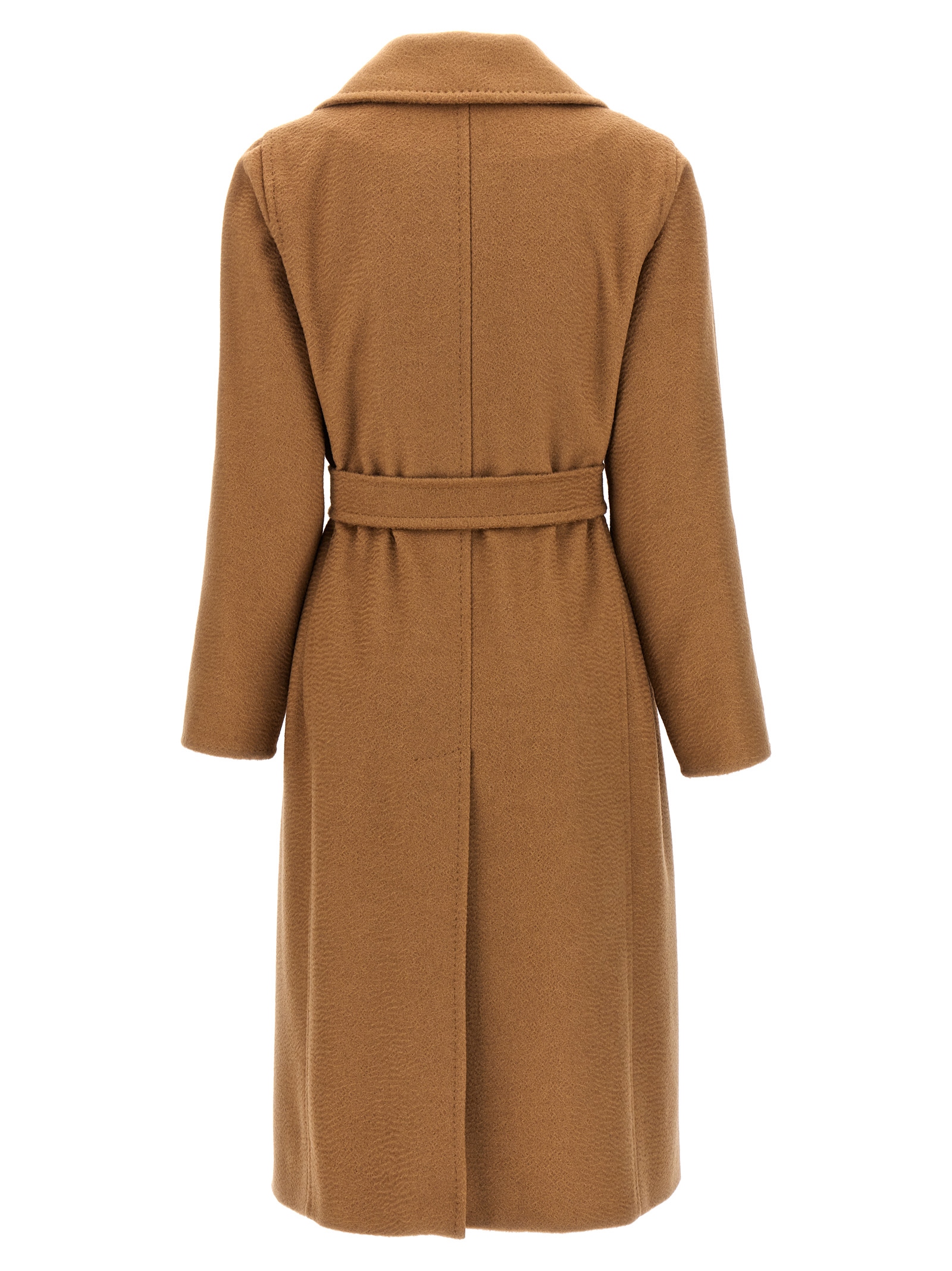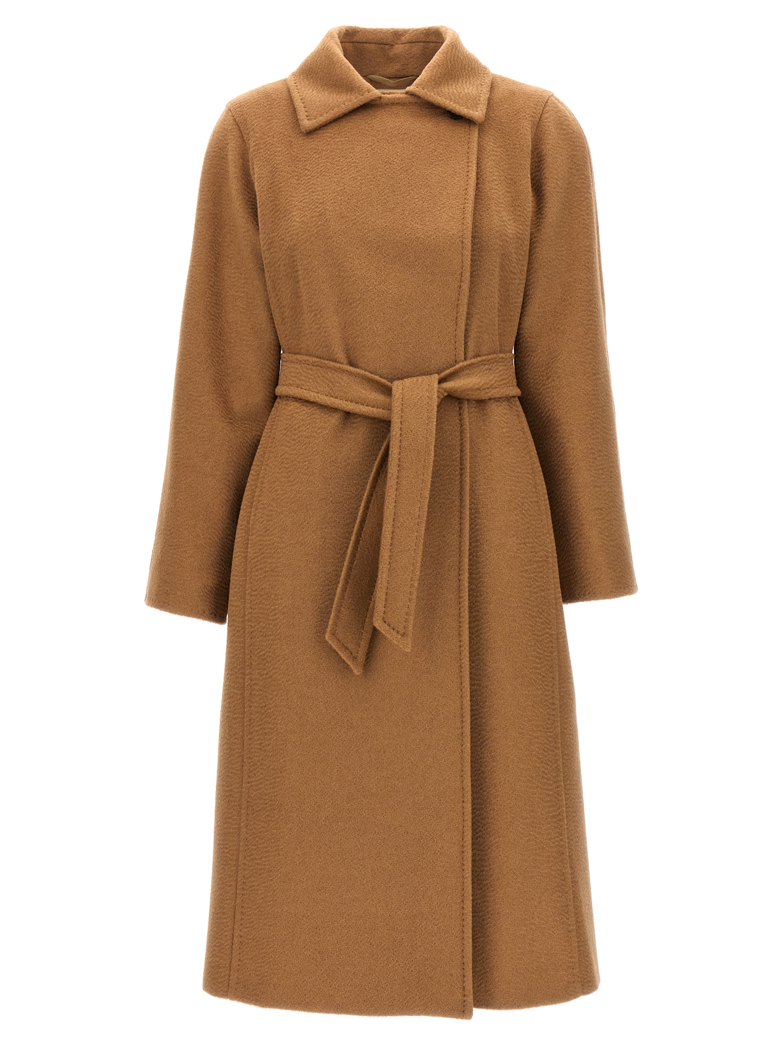 ‘Manuela Icon Coat’ pure sable camel drap coat finished with tailored dot, robe style, wide lapel collar with a dual-use button, pockets, long kimono sleeves, back split, removable belt, monogram viscose lining.