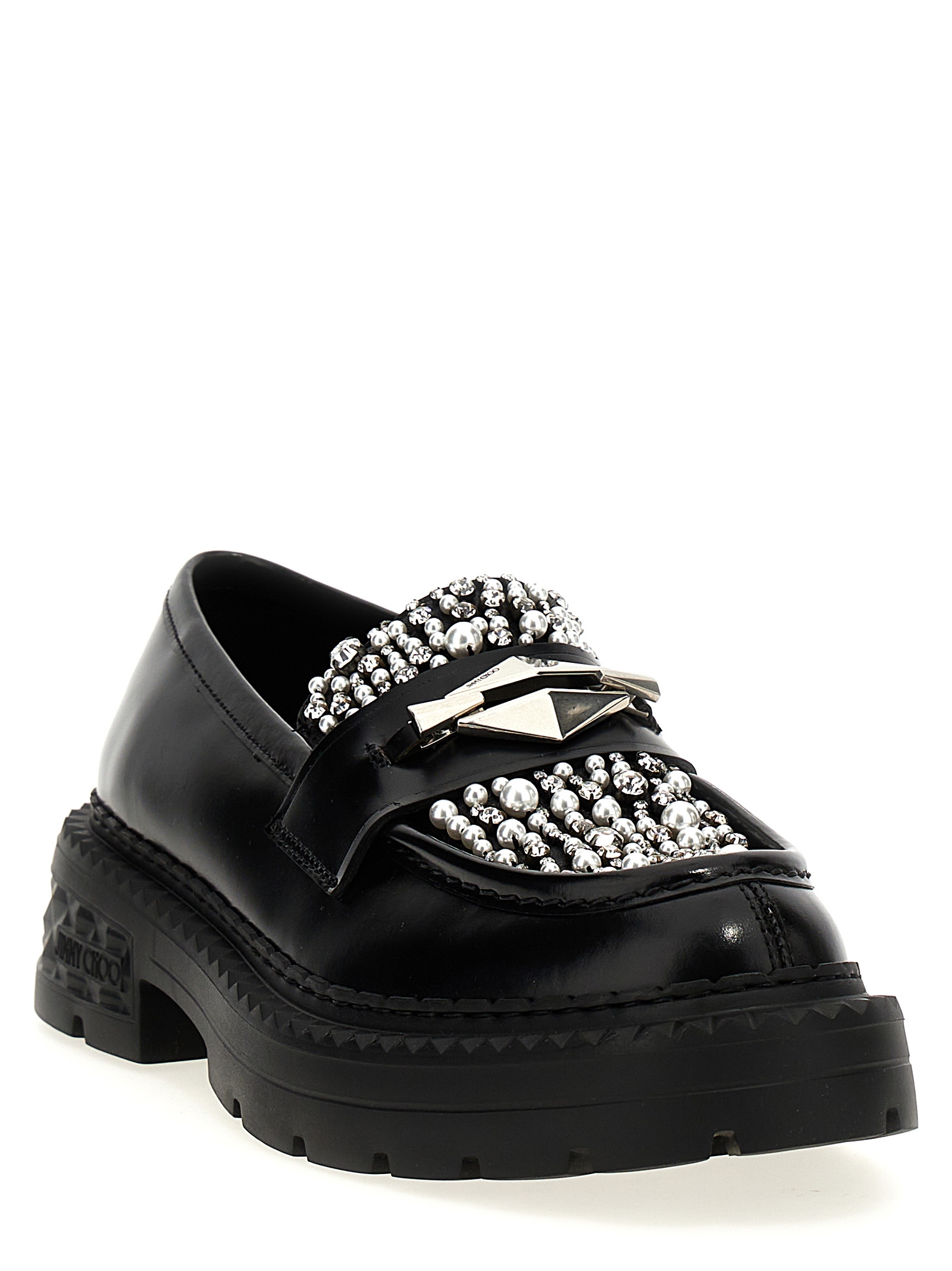 ‘Marlow Diamond’ leather loafers with metal rhinestone detail and front pearls, rubber sole.