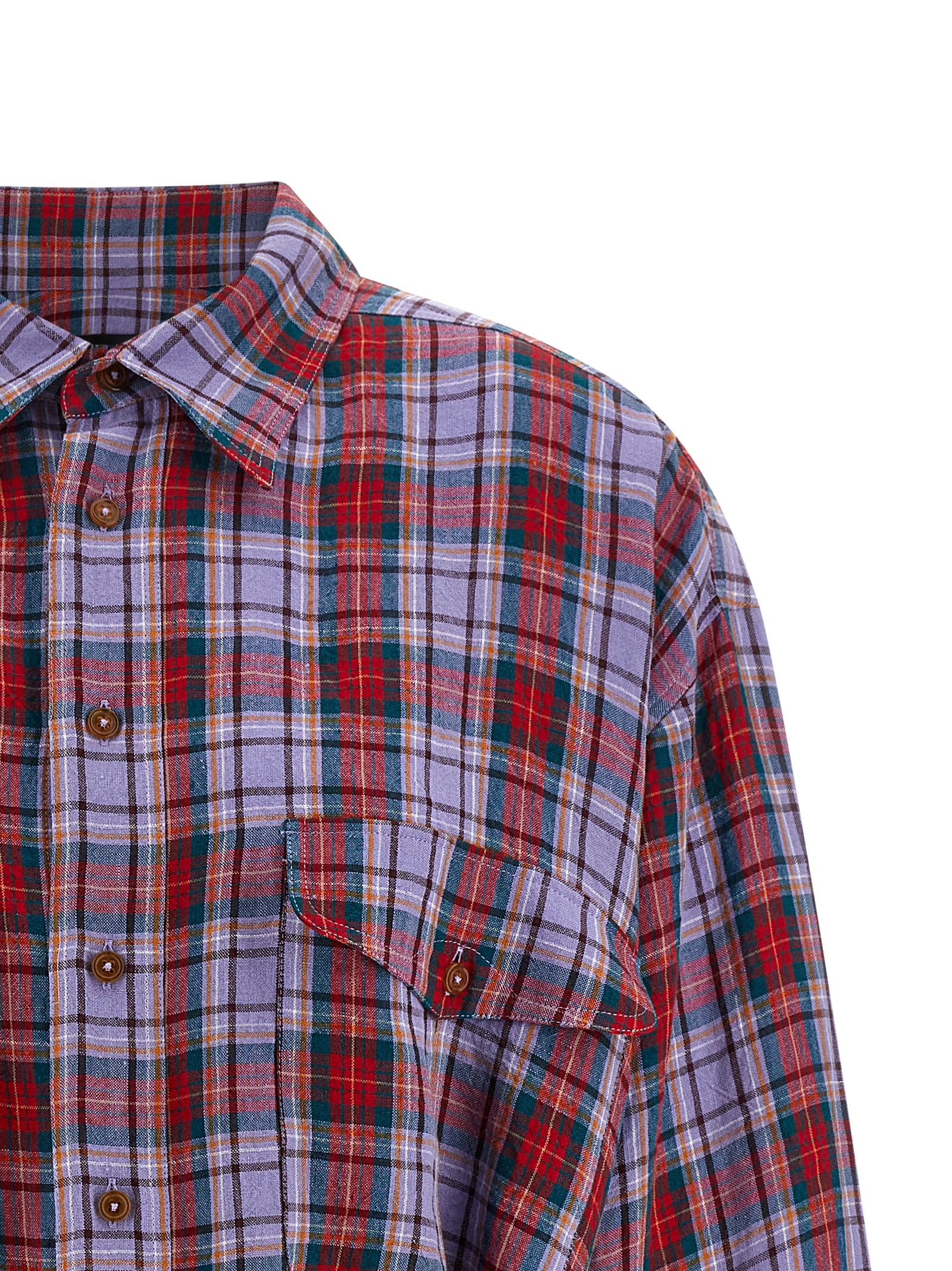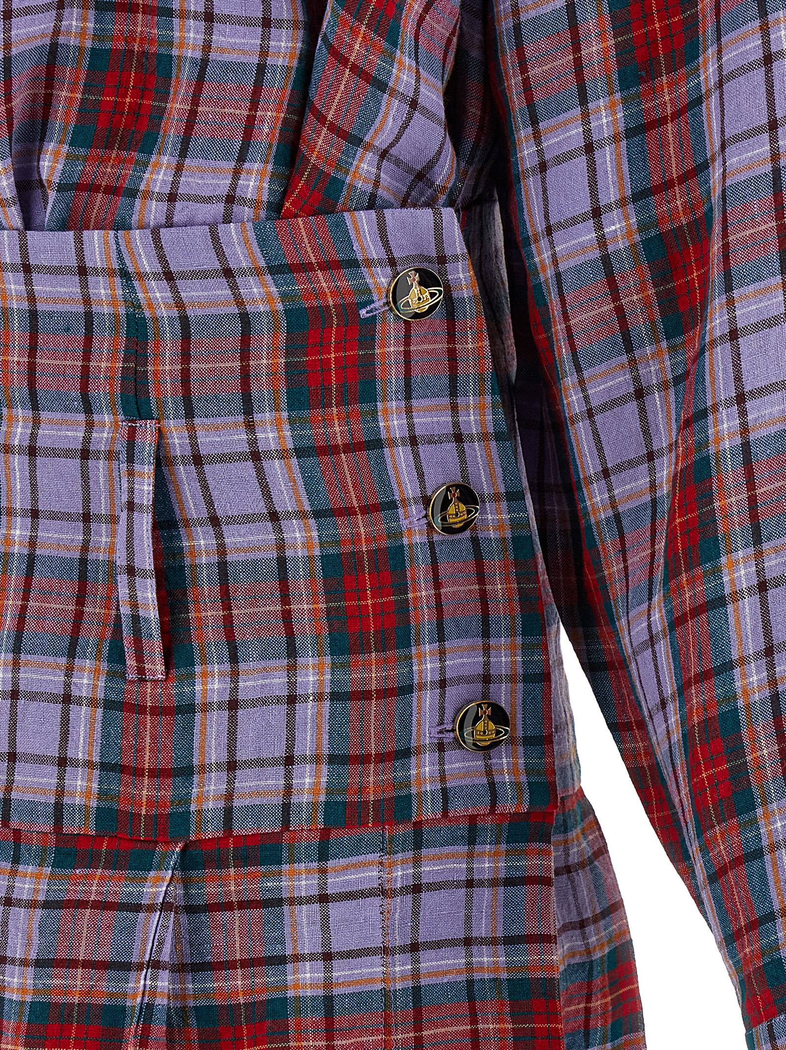 ‘Marta’ mini dress in check print linen, chemisier model, pointed collar, front button closure, pockets, long sleeves with cuffs and dropped shoulder, tone-on-tone superimposed insert with mini skirt with pleats and jewel buttons, asymmetrical hem.
