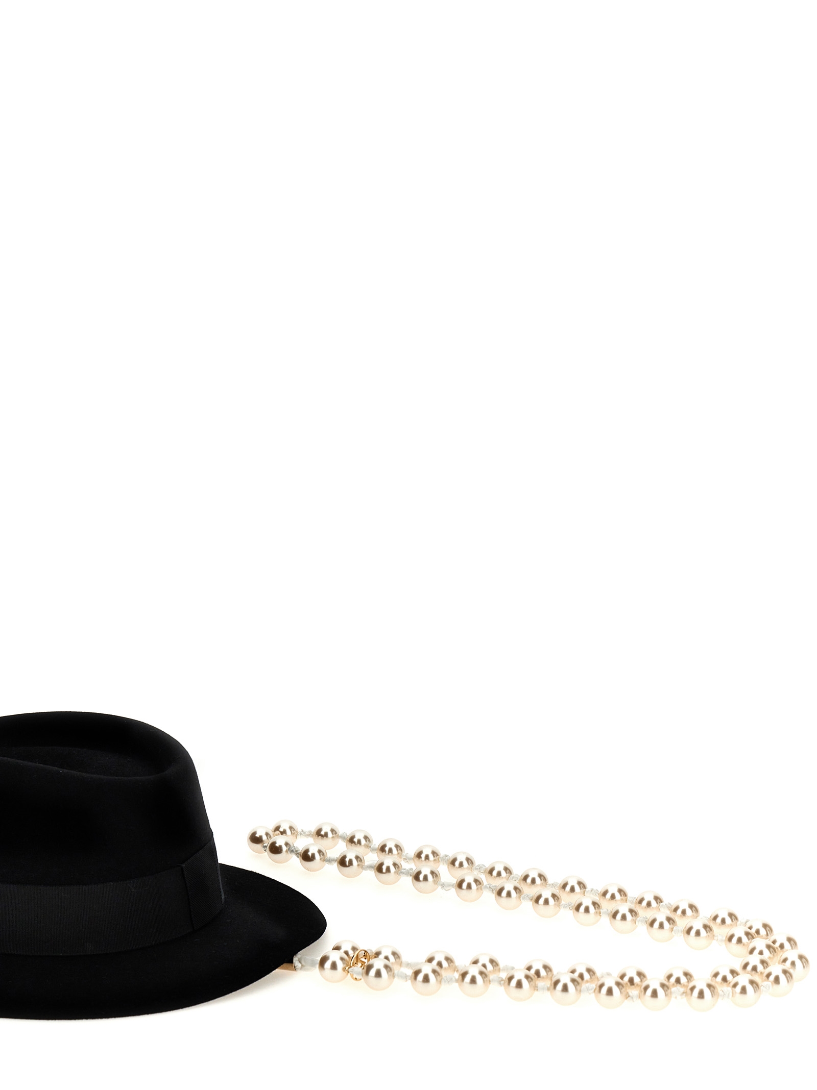 ‘Martine’ crossbody bag in synthetic pearls and fabric, snap hook and gold metal logo. Designed to carry the hat.