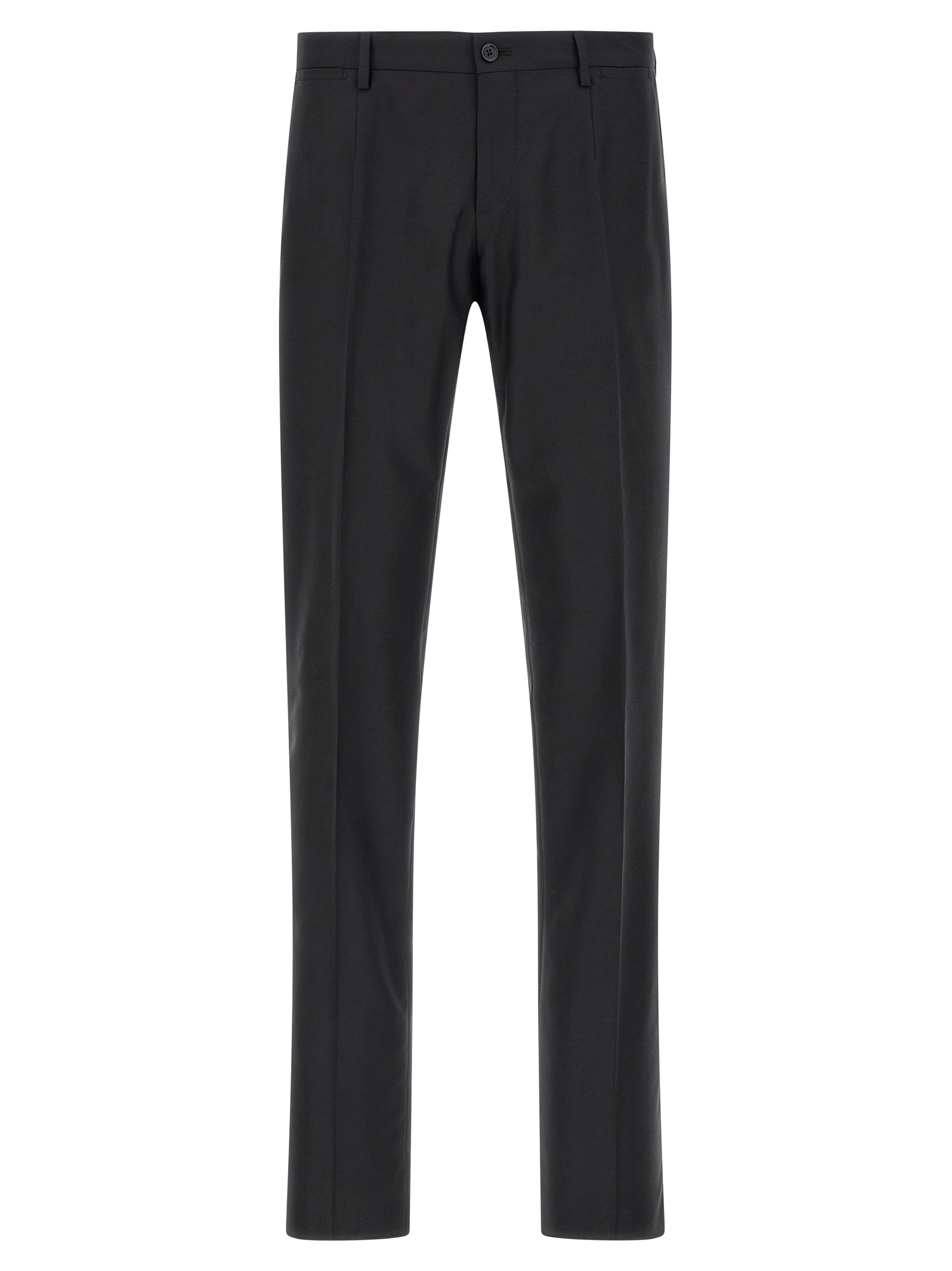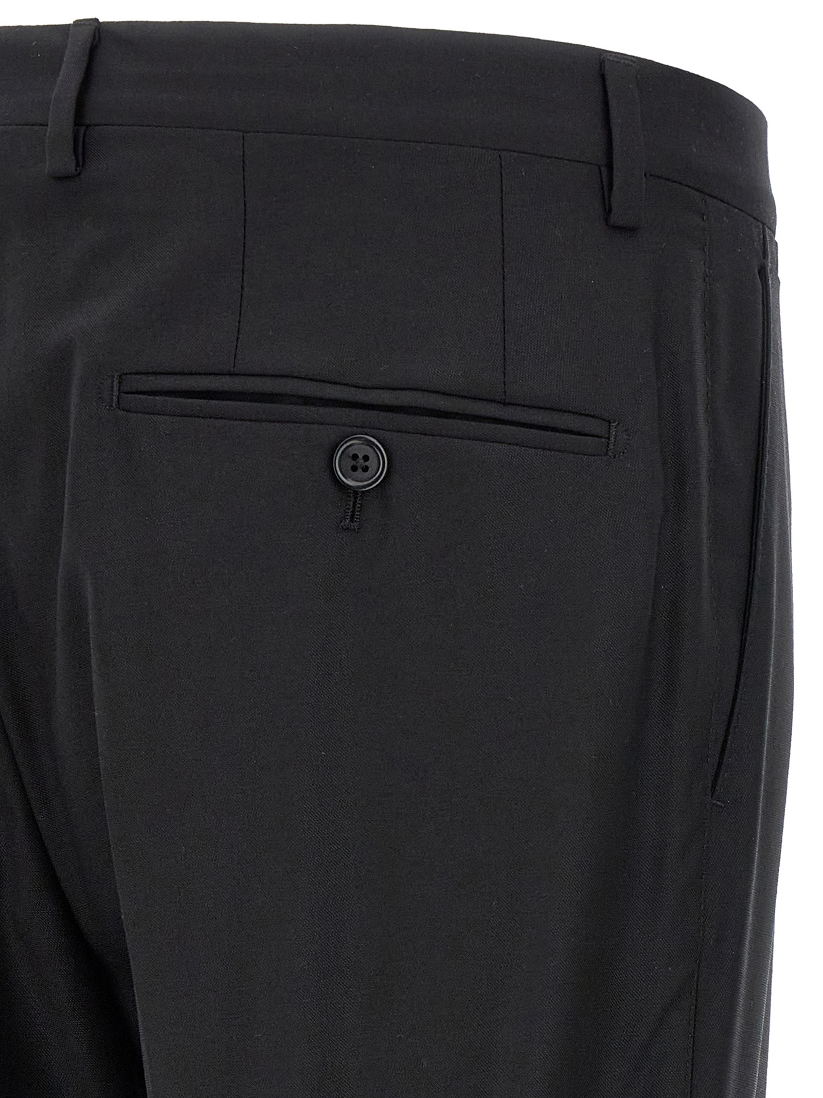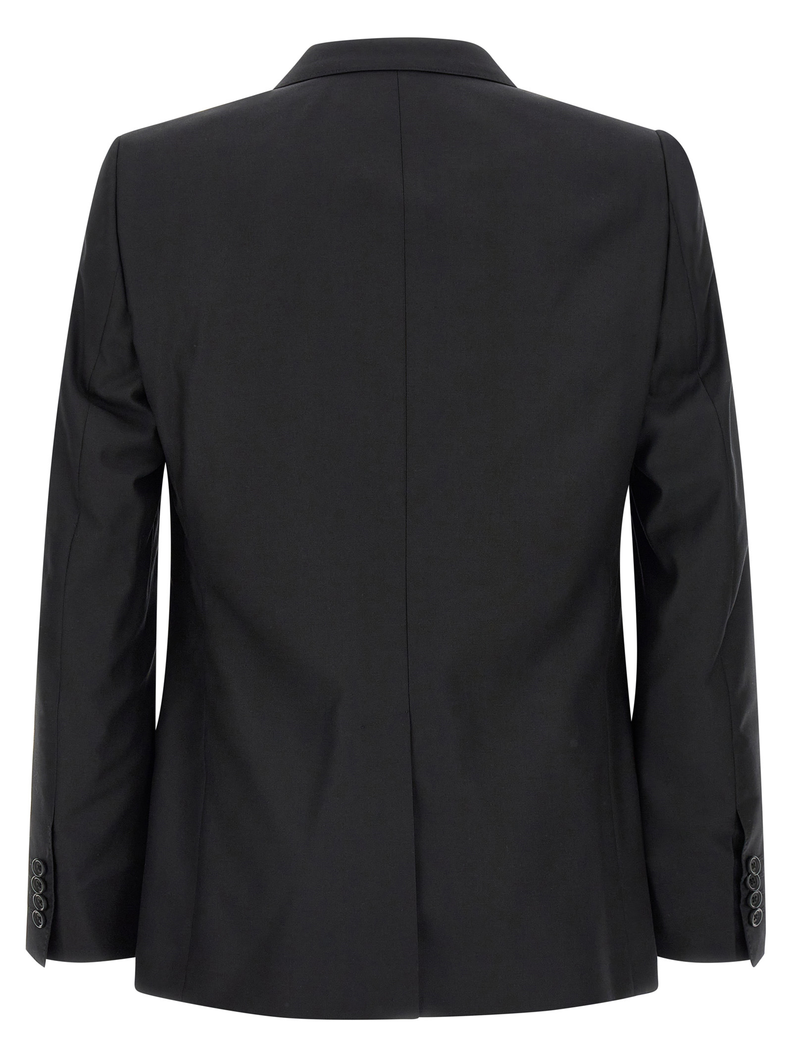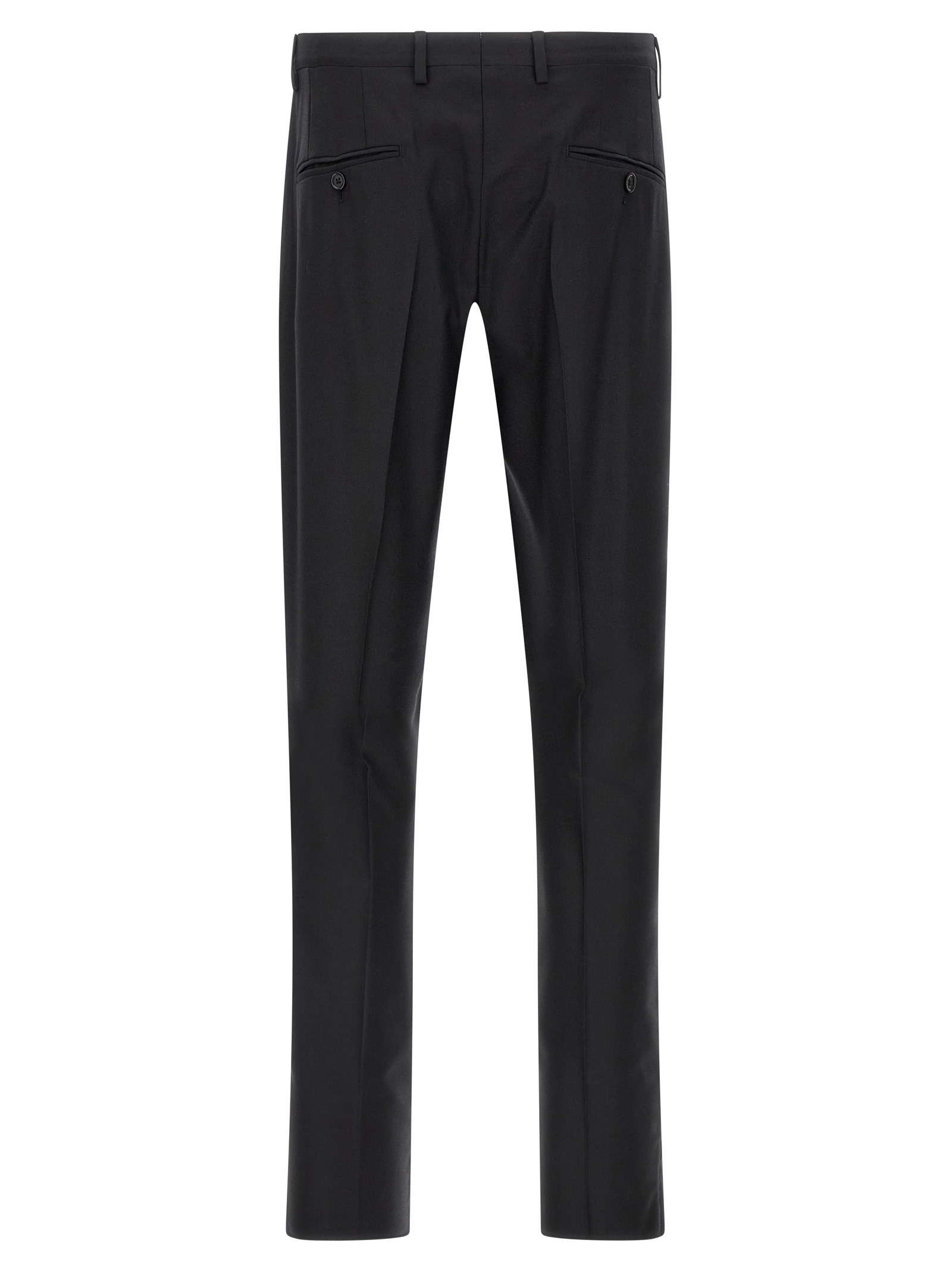 Single-breasted ‘Martini’ wool and silk canvas dress, jacket with peak lapels, pockets, back central split, long sleeves with padded shoulders, straight trousers, zip, button and hook closure, pockets.