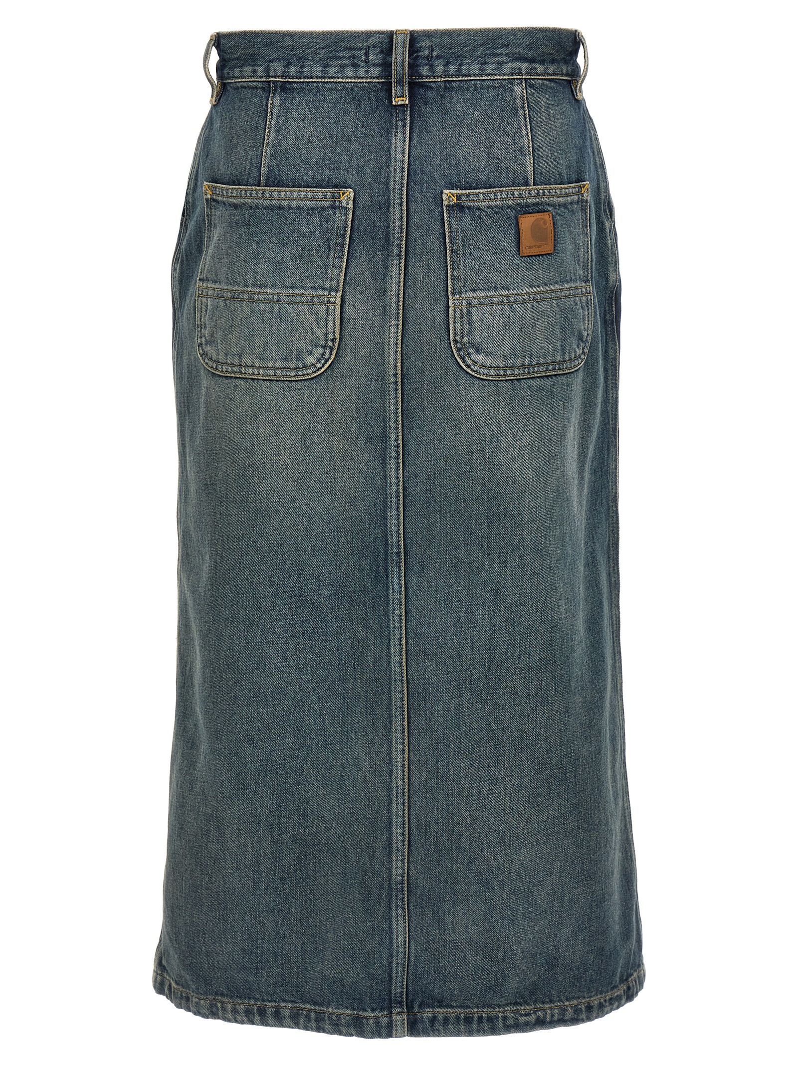 Marvin’ midi skirt in used-effect Smith denim, front button closure, pockets, and back leather logo patch.