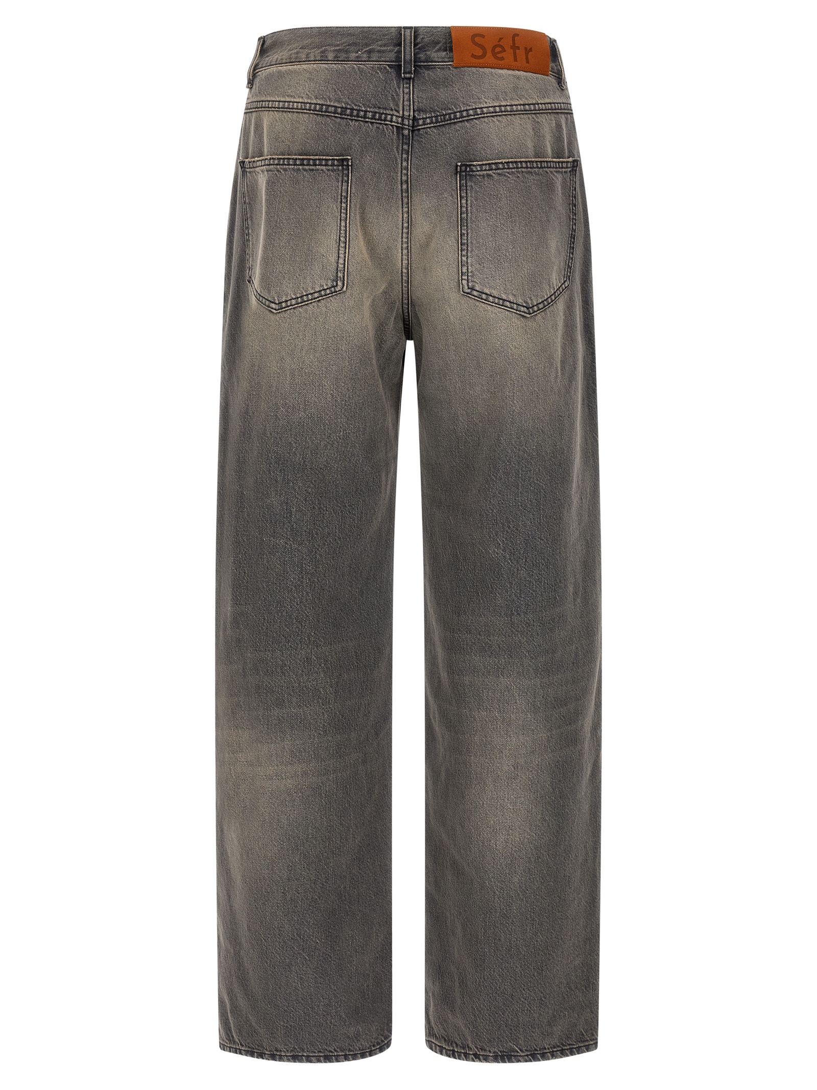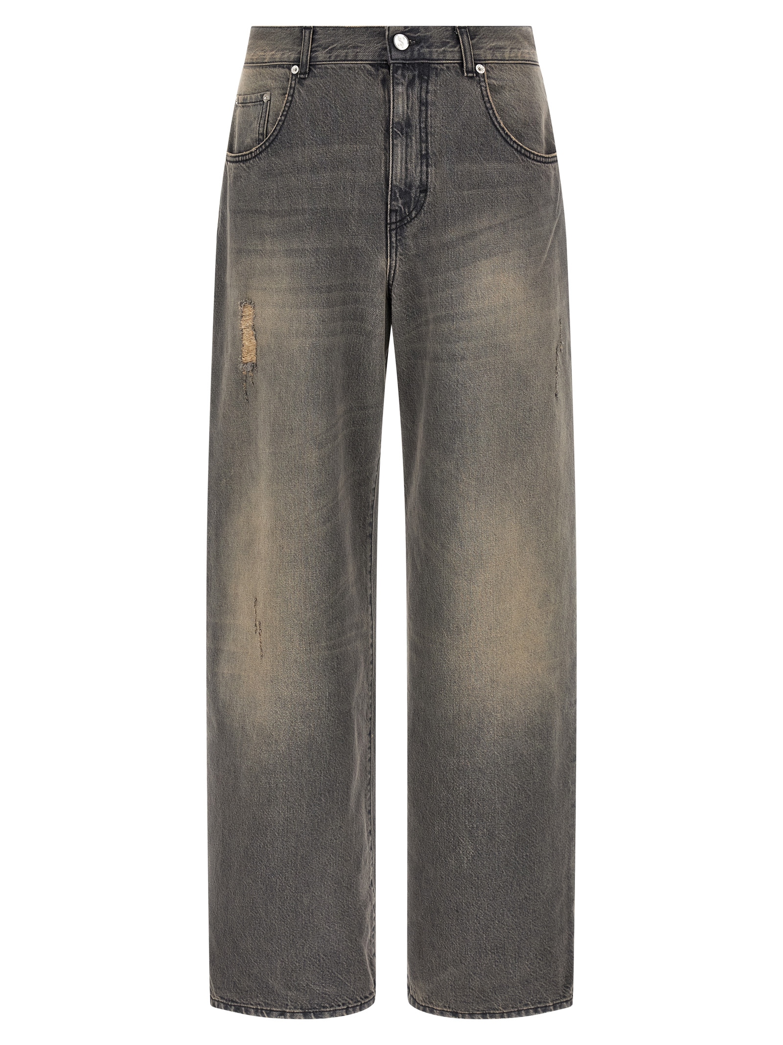 Mass Jeans’ cotton denim jeans with used effect, 5-pocket mid waist, wide leg, front zip and button closure, back suede logo tag.