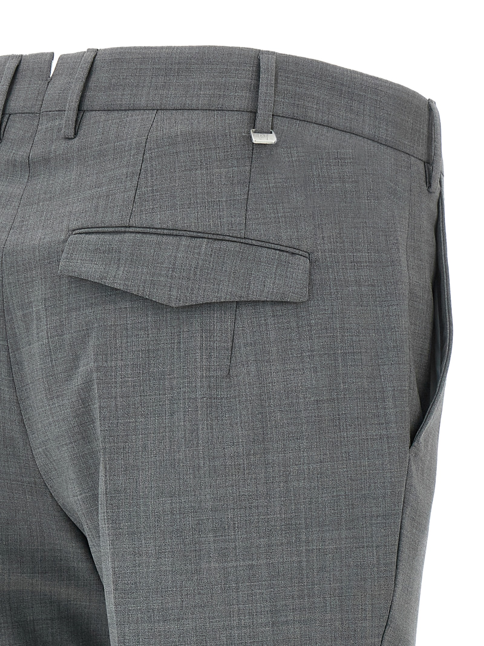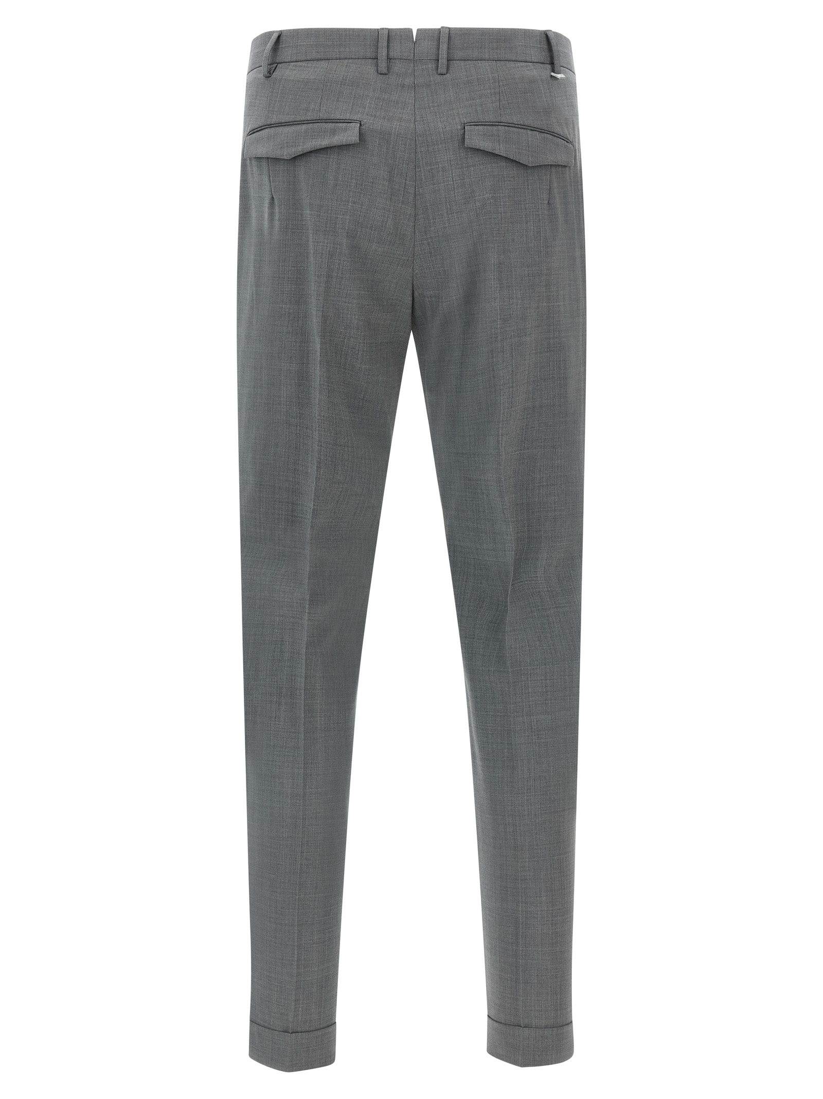 ‘Master’ mélange stretch wool trousers, transversal sartorial design, stretched pleat, mid waist, zip hook and front button closure, pockets, turn-up on the leg bottom.
