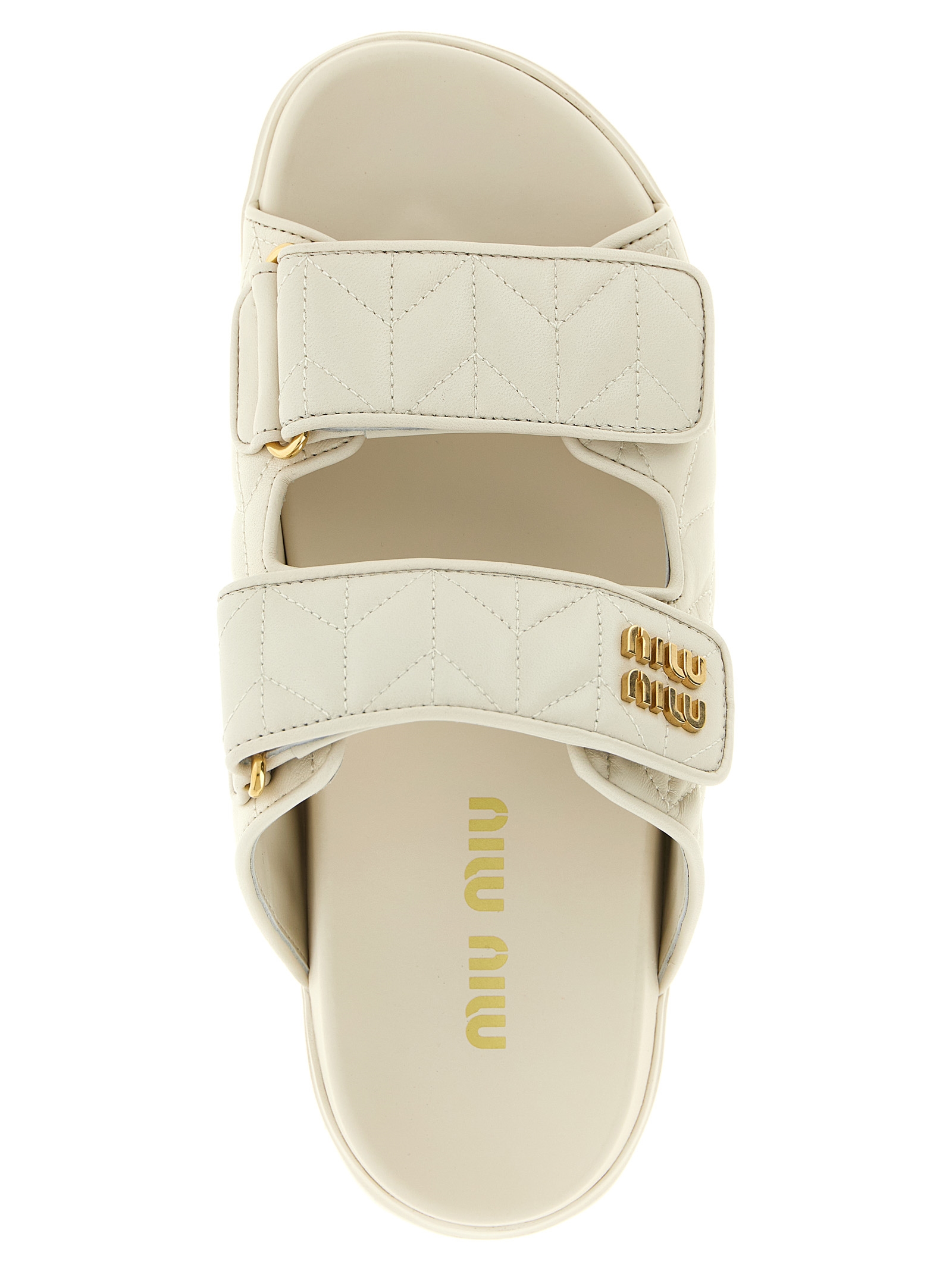 Matelassé nappa sandals with adjustable velcro bands with metal lettering logo appliqué, and rubber sole.
