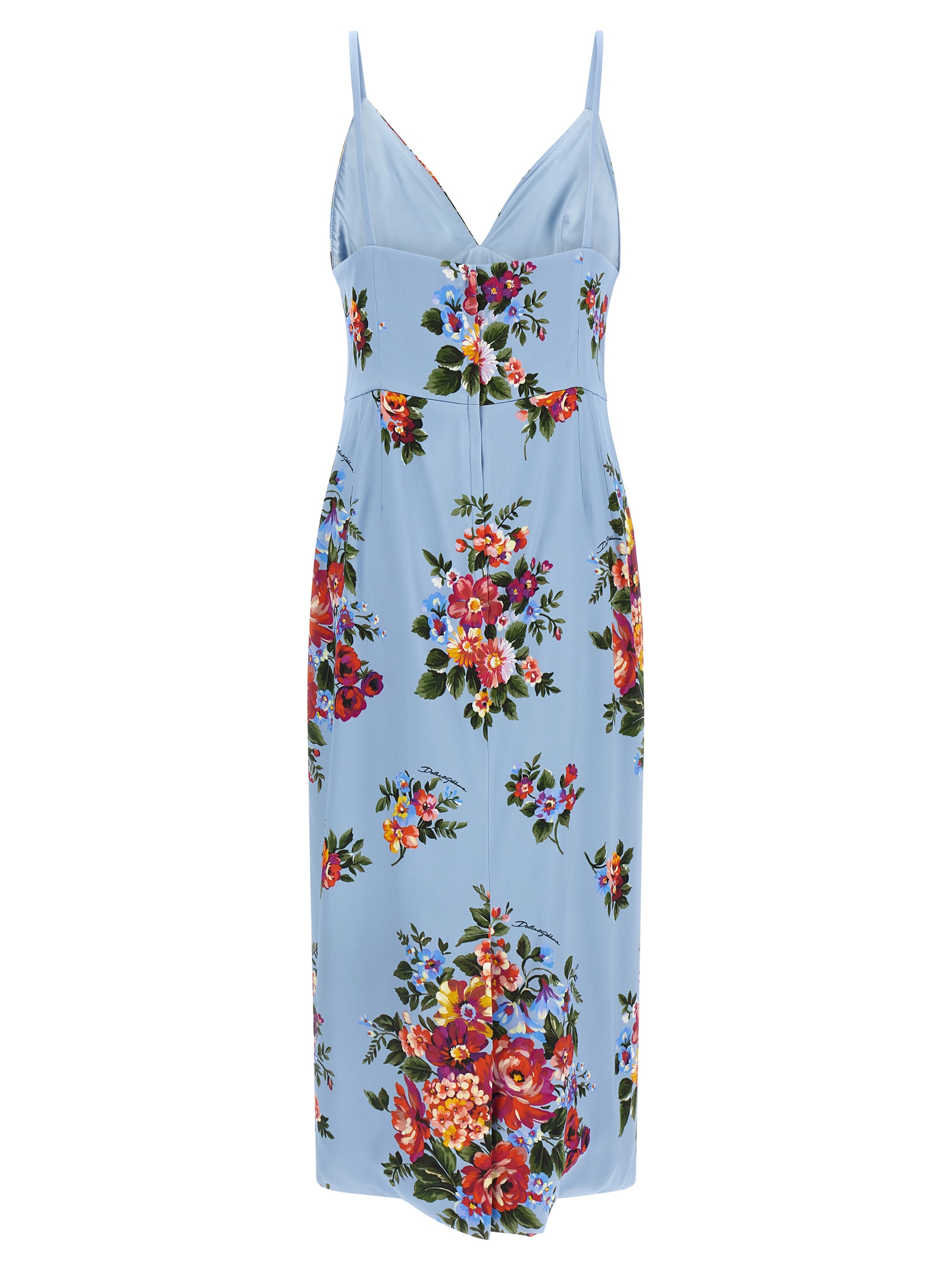 All over ‘Mazzo di Fiori’ print satin midi dress with triangle cups and thin straps, slightly tight skirt with central split at the back, and concealed zip closure at the back.