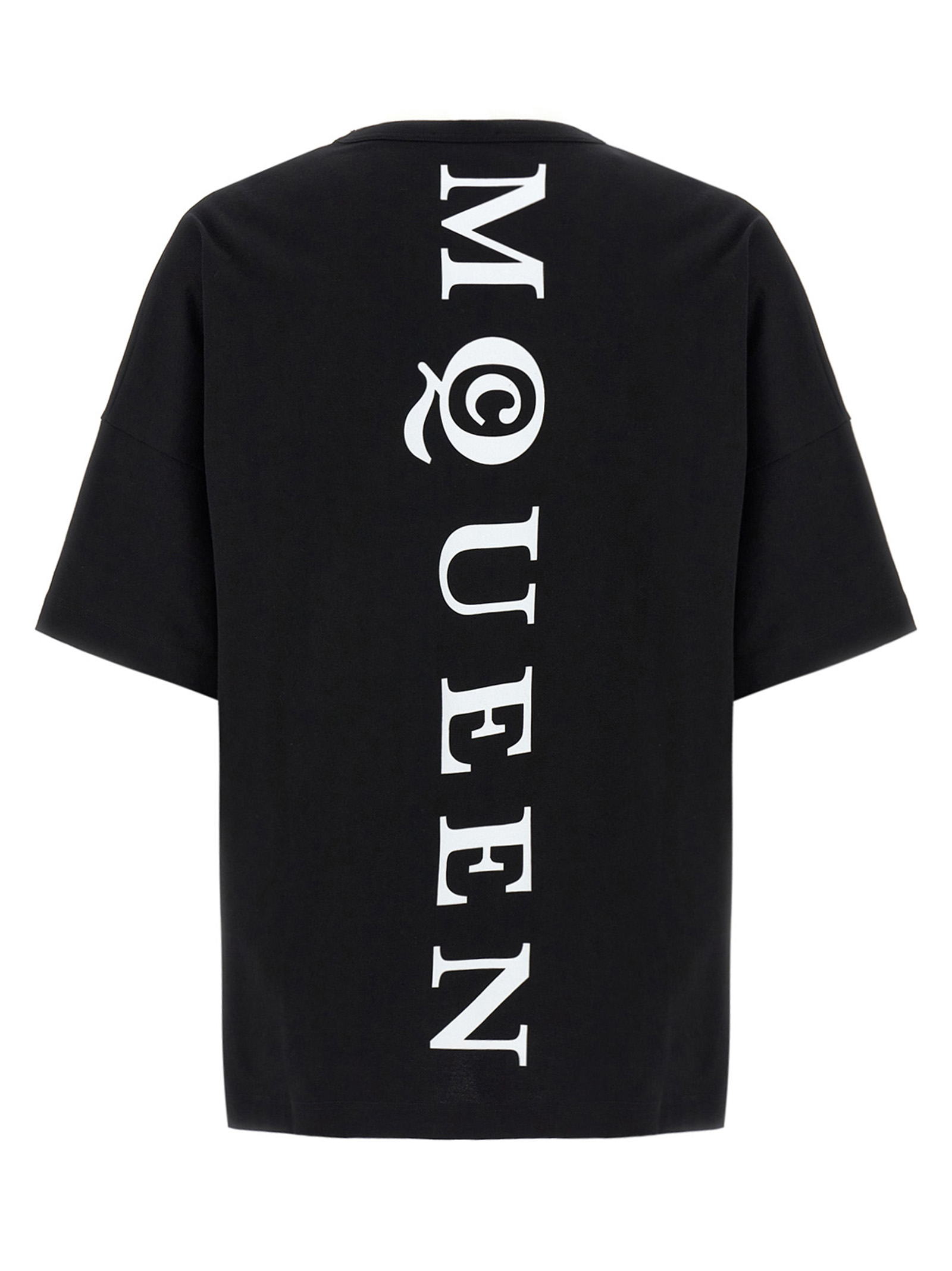 Cotton jersey T-shirt with ‘McQueen’ logo print on the front and back, crew neck, short sleeves with dropped shoulders.