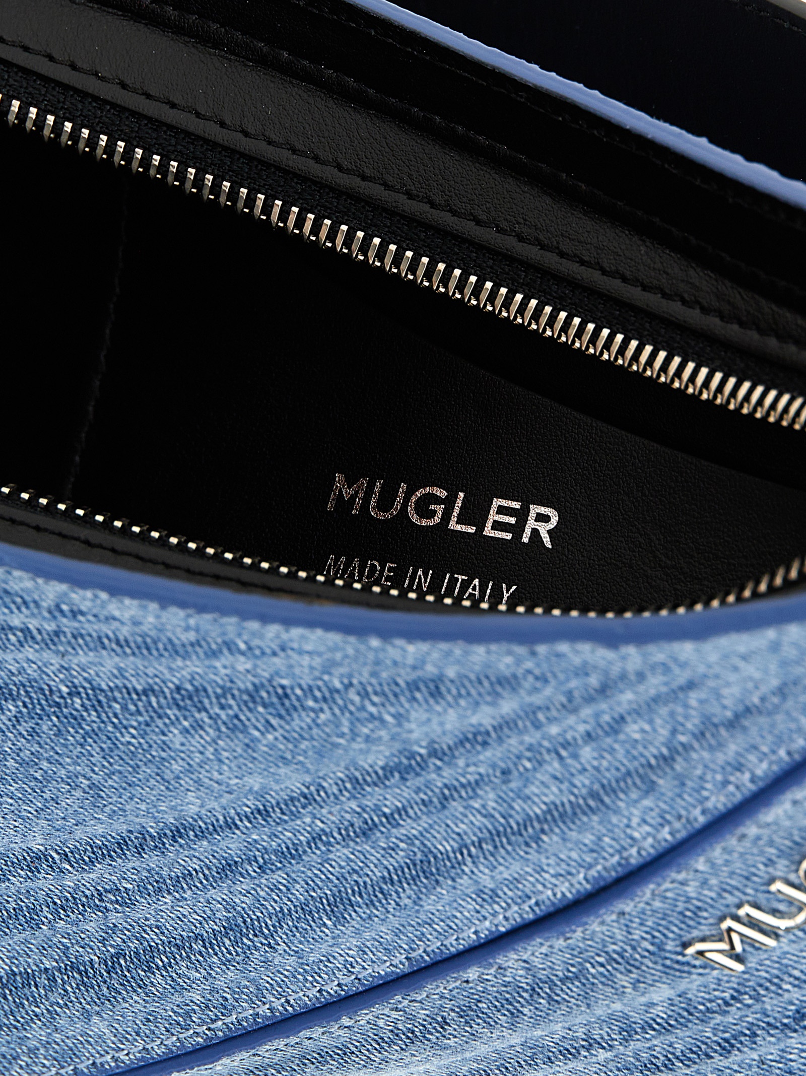 ‘medium denim spiral curve 01’ shoulder bag in denim and leather with zip closure, adjustable leather handle.
