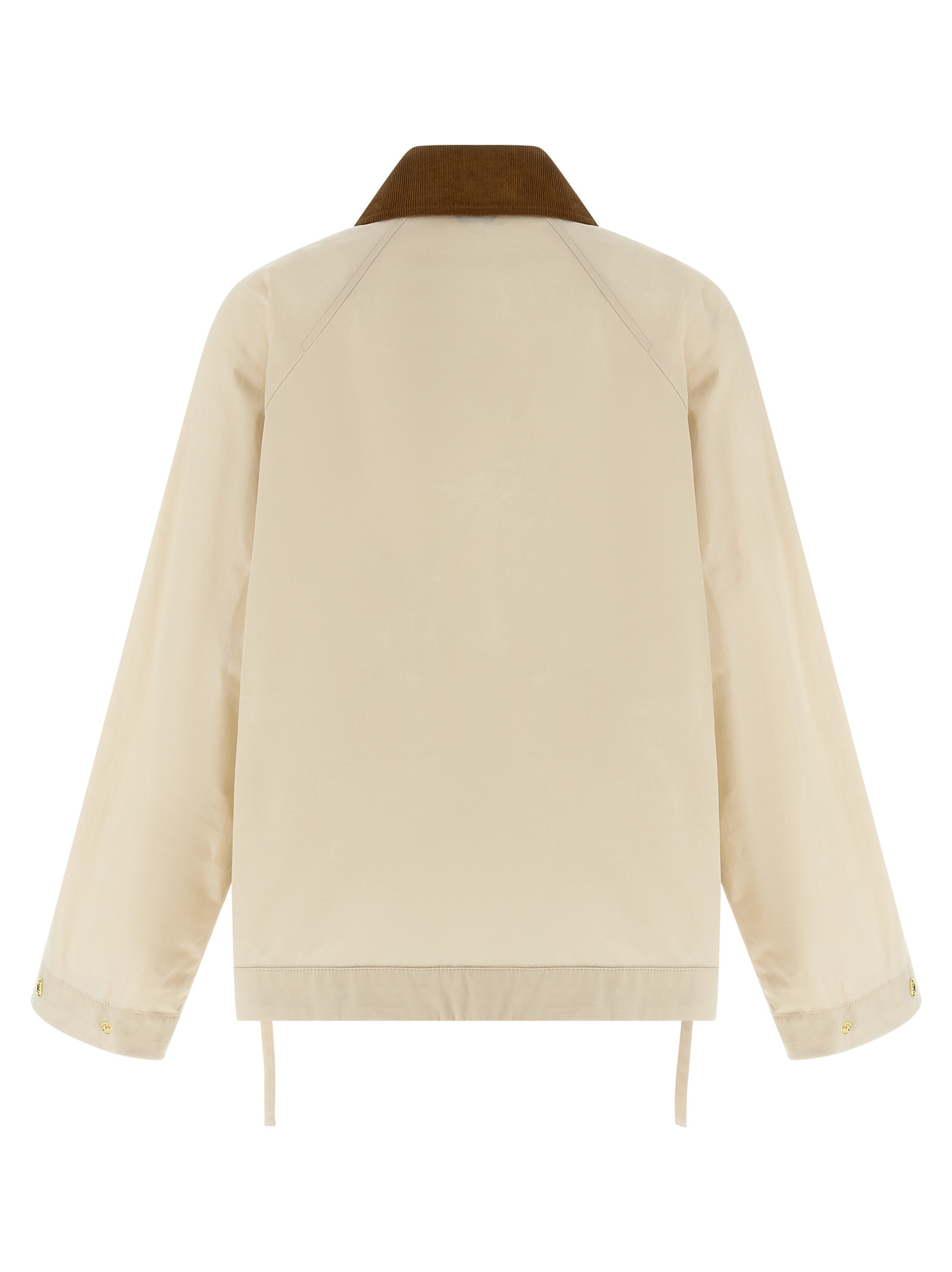 ‘Medland’ waterproof cotton blend rain jacket with tartan lapels, slightly cropped style, contrast velvet shirt collar, logo embroidery and front zip and snap button closure, pockets, adjustable raglan long sleeve with snap button on the cuffs and fold-up, side slits with fabric laces, Asymmetrical hem.