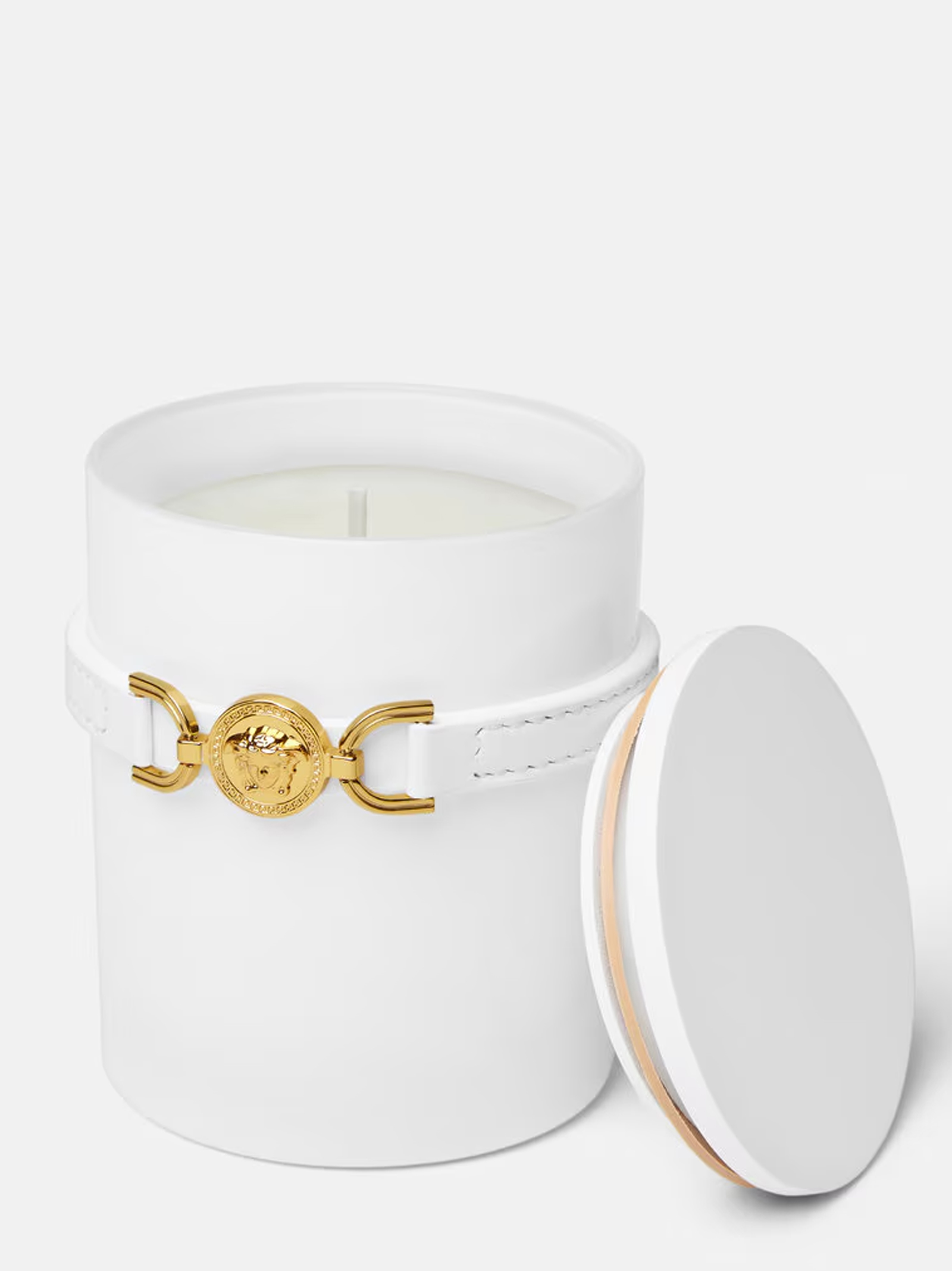 Candle with a delicate scent in a glass jar with wooden lid and a removable ‘Medusa ’95’ leather strap.