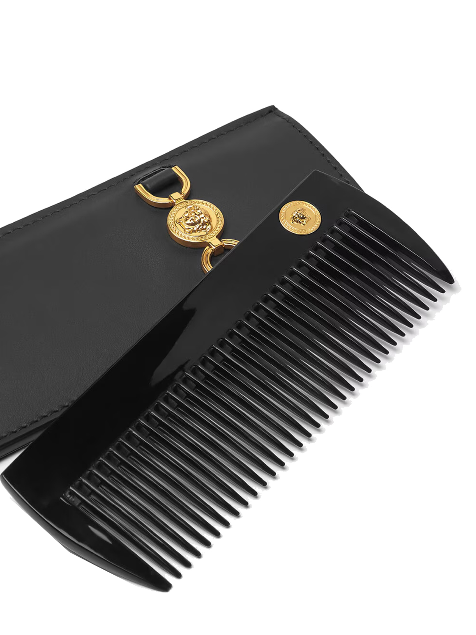Hair comb with metal ‘Medusa ’95’ detail, smooth leather case.