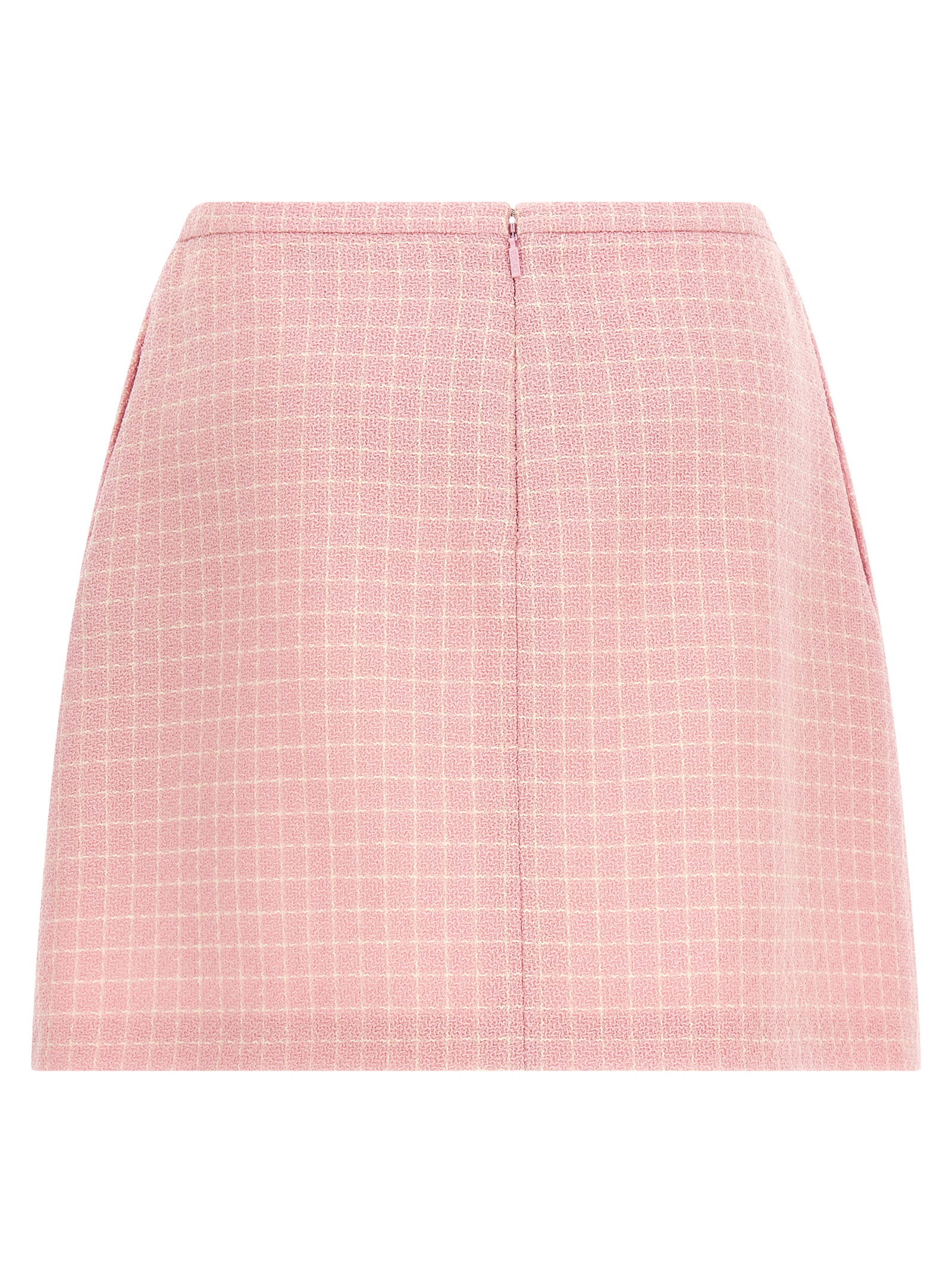 Mini skirt in checked wool crêpe tweed with flared silhouette, metal ‘Medusa ’95’ detail on the front, back zip closure, pockets, cupro lining.